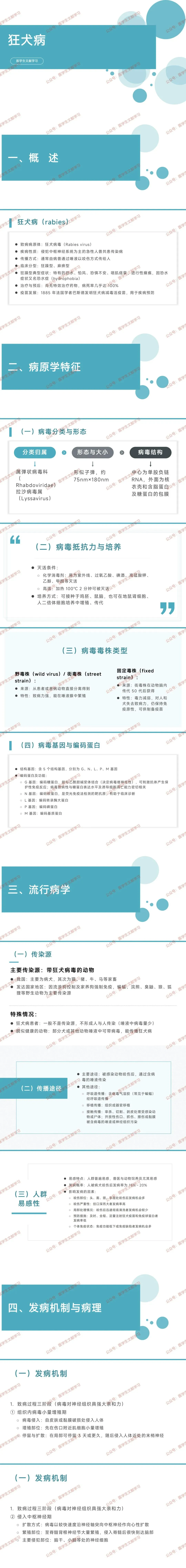 狂犬病由狂犬病毒引发,是侵犯中枢神经系统的急性人兽共患传染病,主要通过病兽唾液咬伤传播,临床分狂躁型与麻痹型。狂躁型有恐水、怕风等典型症状,又称恐水症。目前无特效治疗药物,病死率几乎 100%,1885 年巴斯德发明的狂犬病减毒活疫苗可用于疾病预防。