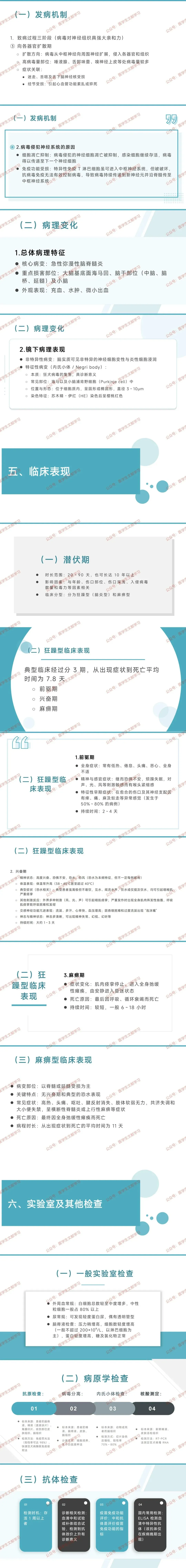 - 确诊诊断:通过检查发现病毒抗原、病毒核酸,或尸检时在脑组织中找到内氏小体。