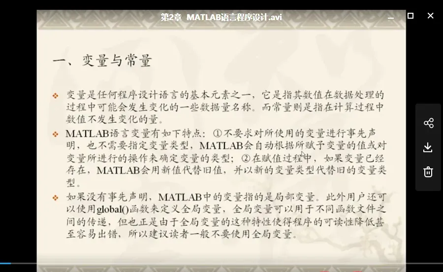 在科研探索与工程实践的过程中,MATLAB 凭借其卓越的数值运算性能与功能多样的工具箱,已成为数据分析、建模仿真、图形可视化以及算法研发等多个专业领域的核心工具。对于科研人员及研究生群体来说,熟练掌握 MATLAB 的操作技巧与应用方法,不仅能显著提升数据处理与分析的效率,更能为高质量论文撰写与科研项目推进提供坚实的支撑。基于上述背景,本篇默默整理并推荐一套系统化的 MATLAB 学习课程资源,涵盖从入门基础到高级应用的完整体系,包括函数运算解析、关键技术讲解、数值求解方法及大量实际案例分析。该系列资源以视频讲解、配套PPT、源代码与示例数据等多种形式呈现,适合各阶段学习者逐步深入,系统提升 MATLAB 应用能力。(下滑文末免费领取matlab最全系列电子资源)第一部分|Matlab 入门基础课程