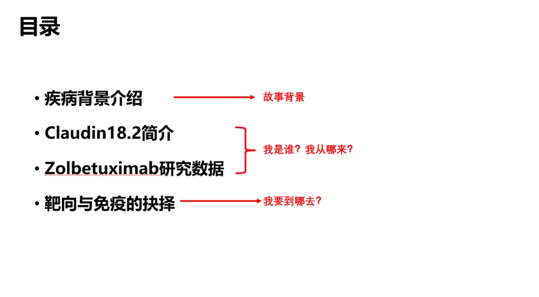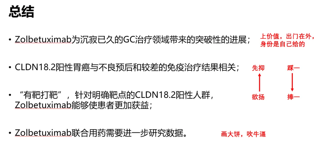 现在的舆论环境,我先来个免责声明,我纯属闲着无聊瞎BB,你觉得我说的不对,一定就是你对,不要留言和我争论 ~昨天整理电脑上面的资料的时候发现了上家公司面试时候做的幻灯,突然想到这么多年,遇到很多人好像并不是很知道怎么做学术幻灯,或者怎么讲PPT,正好闲赋在家,就分享一些个人想法。因为这么多年通过做幻灯,讲幻灯确实给我带来了比较多的自信和认可,有一些底层逻辑我觉得可以拿来用。其实学术类型的PPT,不管是医学、市场还是销售去做去讲,第一件需要做的事情就是问自己,我,为什么要去做/讲这套幻灯?我希望通过这套幻灯实现什么目的?这么多年,很多人对我的评价是应该去commercial,因为我“铜臭”味很重,我做事的出发点永远是,我这件事做了,能有什么改变?能带来更高的销量吗?对,我只看钱(销量)。因为一直以来我的底层逻辑都是,销售是直接赚钱的部门,我不是,那我的工资是销售赚来的,我就应该在公司合规允许的范围内,尽可能的帮助销售提升销量。我要强调,帮助销售提高销量和保持医学的独自性,或者说尊严吧,不冲突,至少这十几年的职场上,我是没觉得被销售push或者挑战过。所以在面对具体的问题的时候,要拆解,我当时收到的面试题目是《胃癌诊疗中Zolbetuximab与免疫治疗的区隔》,带入实际场景,这大概率是讲给医生听的一场科室会,你的目标应该但不限于,在特定情况下,临床诊疗方案选择中,选择Zolbe的权重要高于免疫治疗。一些人不会设定这样的目标,所以幻灯看下来就是单纯的介绍两种大方向的不同有哪些,但是落不到用药上,如讲。因此在这个大前提下,最简单的框架就是经典的人生三问,我是谁?我从哪来?我要到哪去?前两部分内容我就不展示了,数据到处都有,简单的呈现就行,有几个建议且看一下:- 数据呈现的时候不要过于详细,我见过很多密密麻麻一堆的数据,呈现的事无巨细,没有必要。议论文在于“借题发挥”,论点论据论证,论据够用即可,或者说足够服务你的论证,支撑你的论点就行了。不是让你展示你知道的多清楚的,这是新人特别容易出现的问题,就怕听课的人漏掉了啥,不信我怎么办。