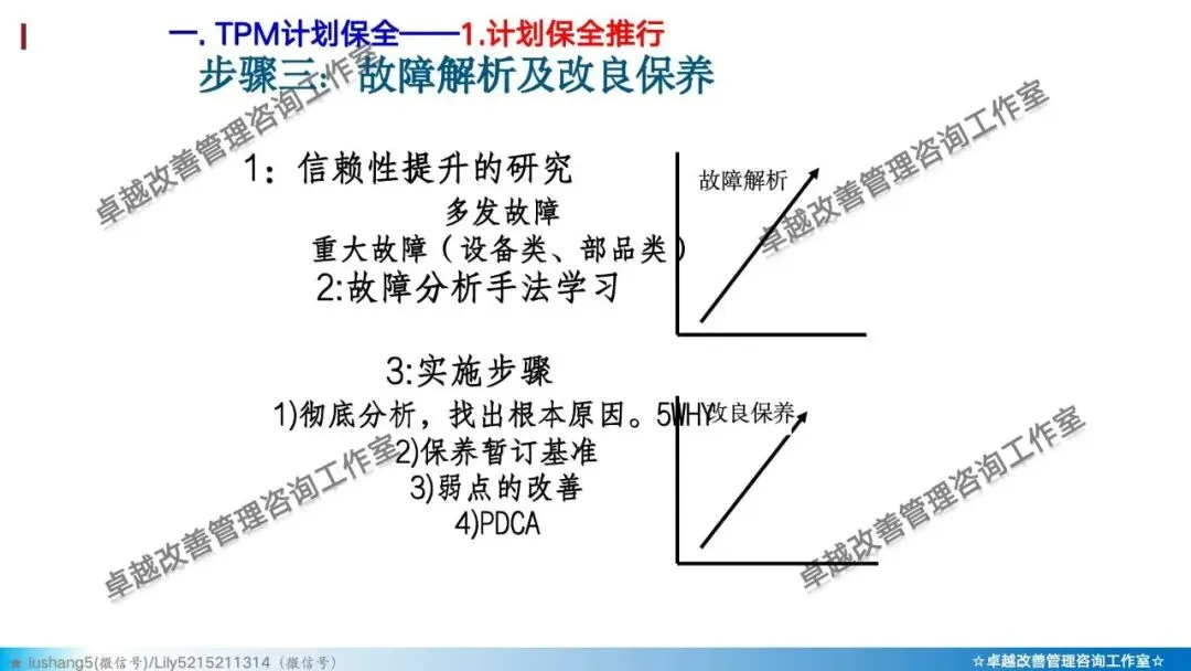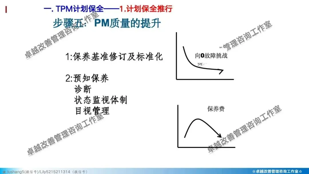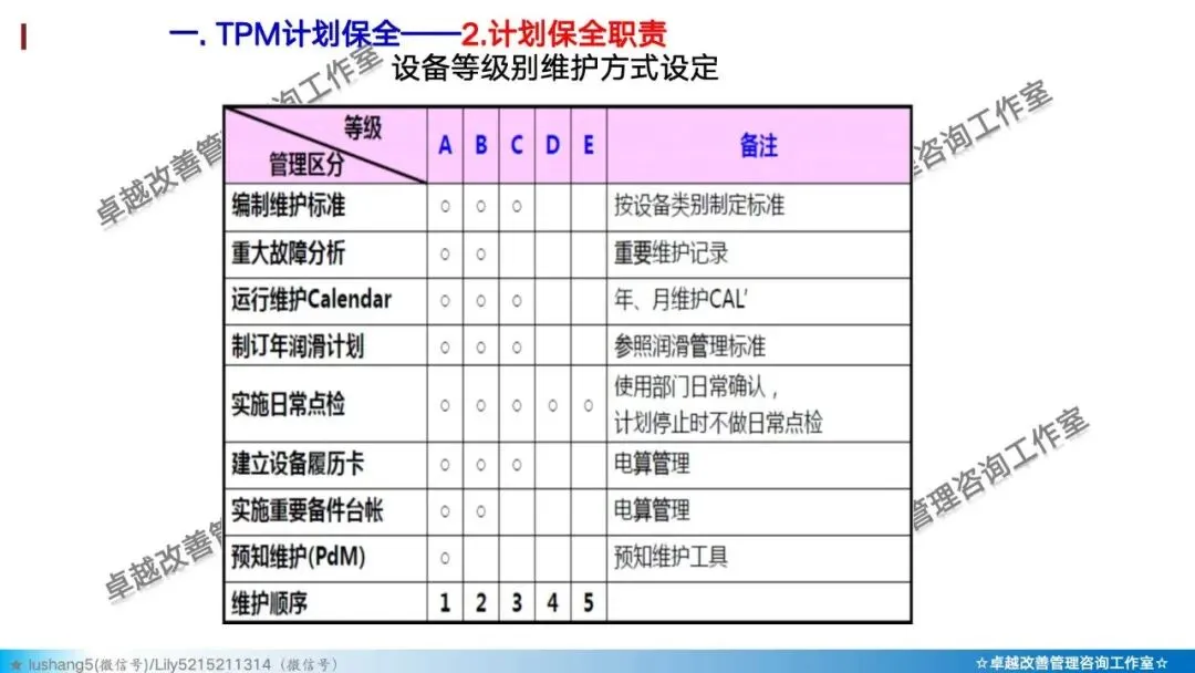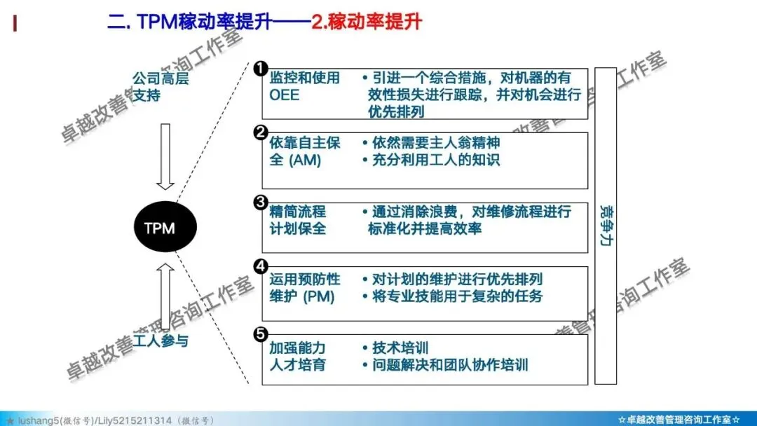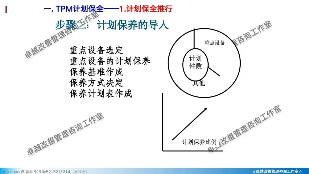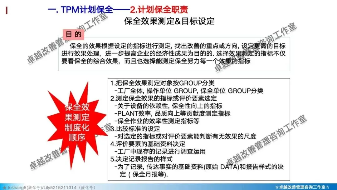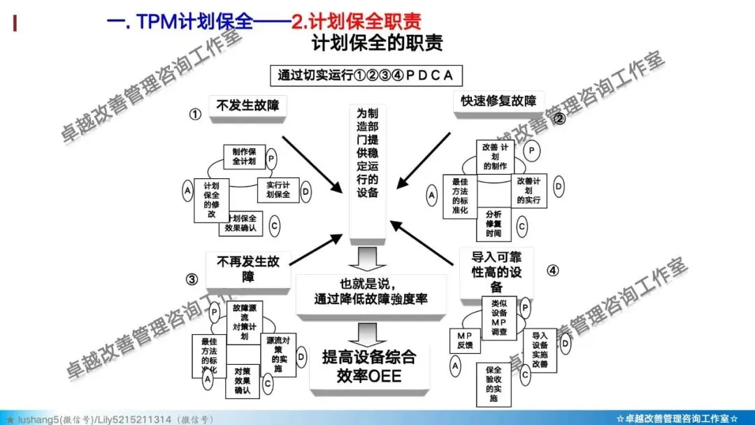 · 与计划保全的区别:计划保全着眼于维持设备现有水平的正常运转;而个别改善则着眼于突破现状,追求设备效率的极限(如OEE(设备综合效率)从60%提升到85%)。
