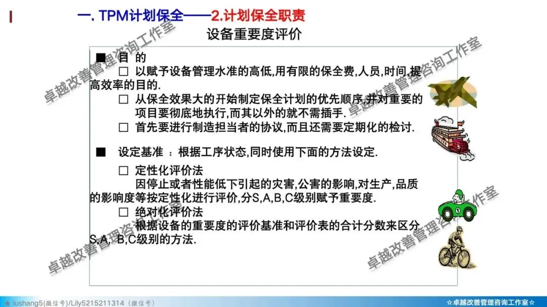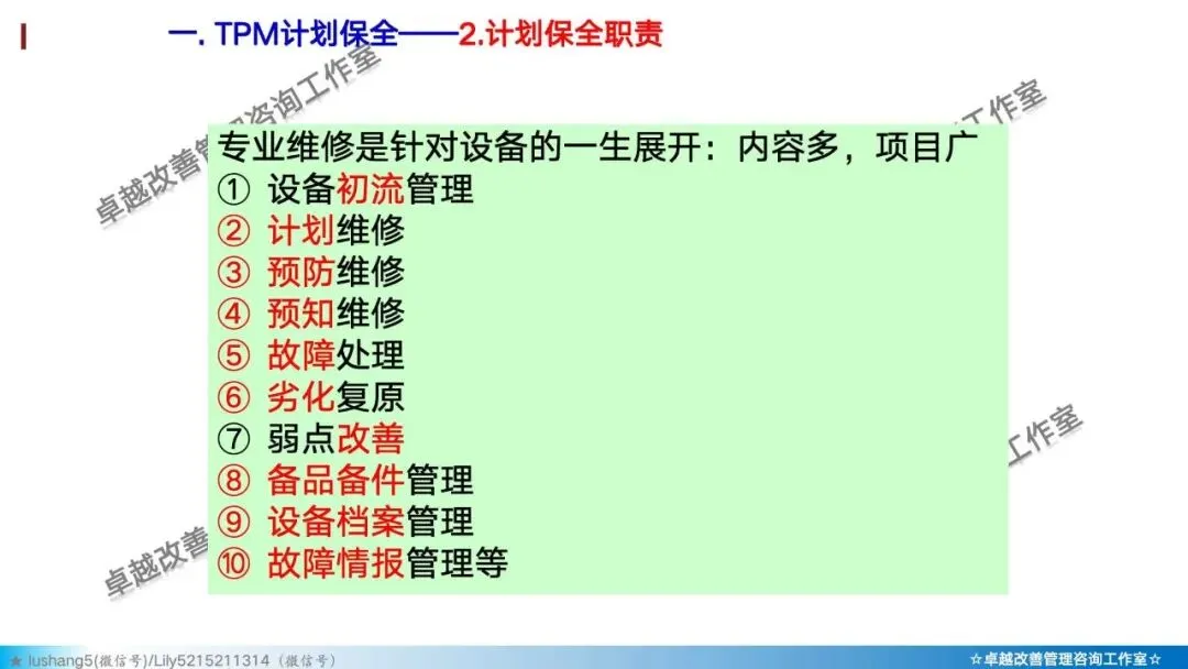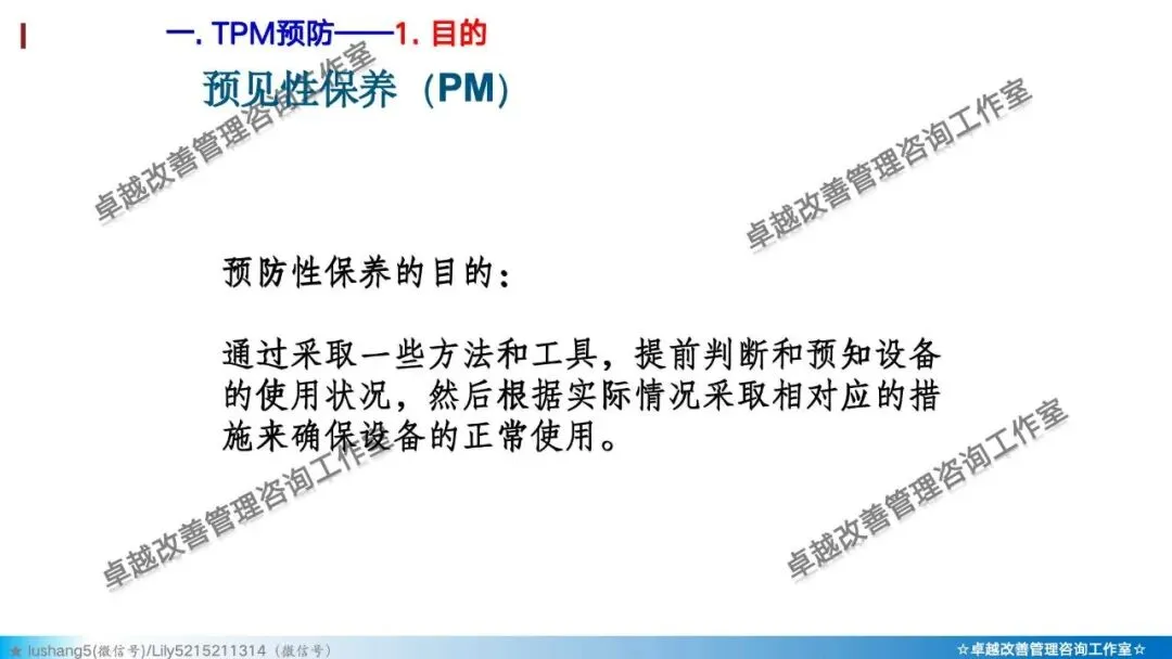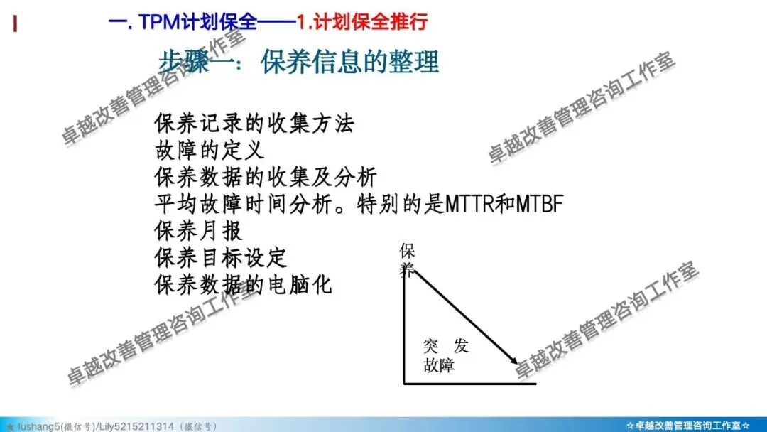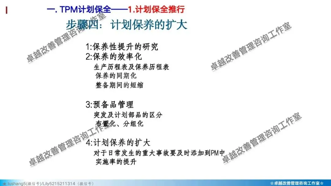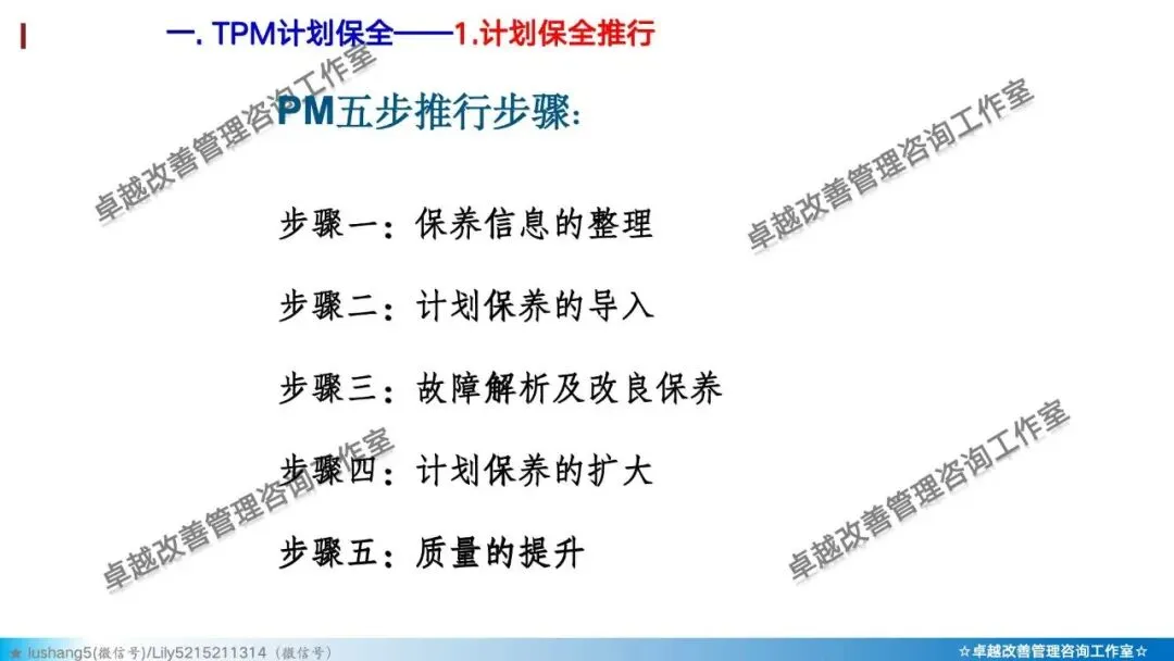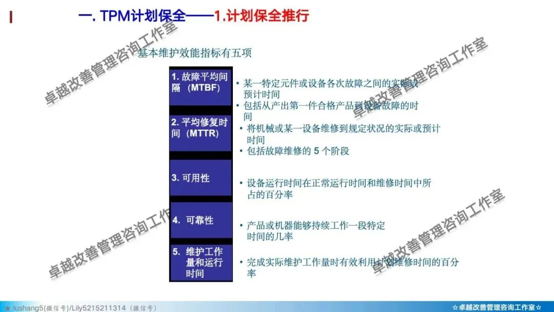 · 与计划保全的区别:计划保全着眼于维持设备现有水平的正常运转;而个别改善则着眼于突破现状,追求设备效率的极限(如OEE(设备综合效率)从60%提升到85%)。