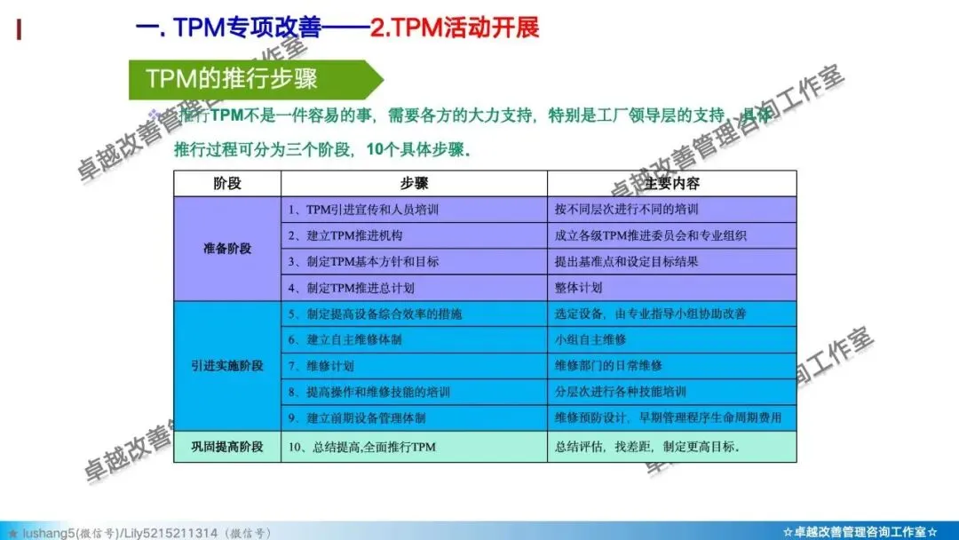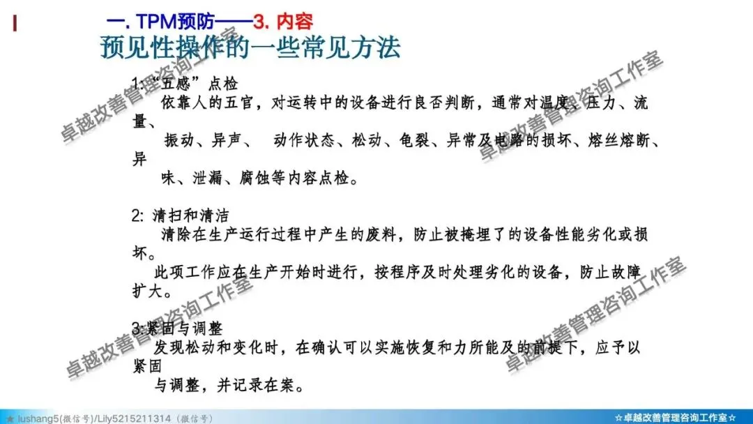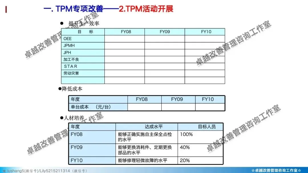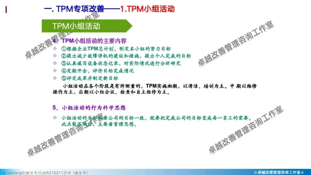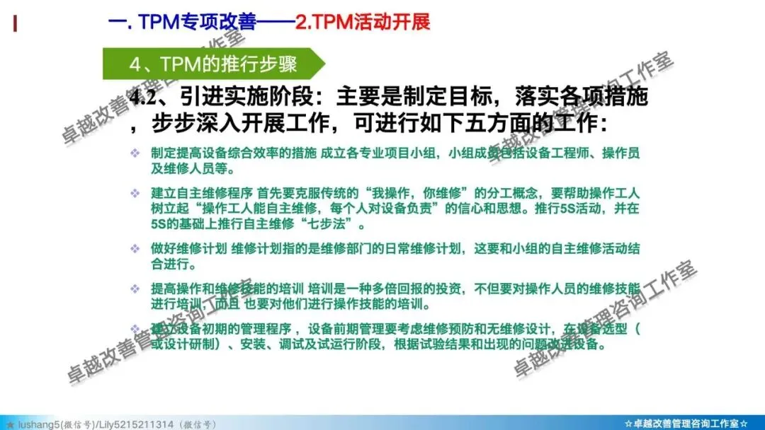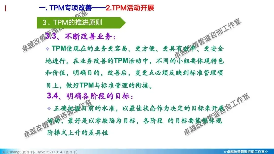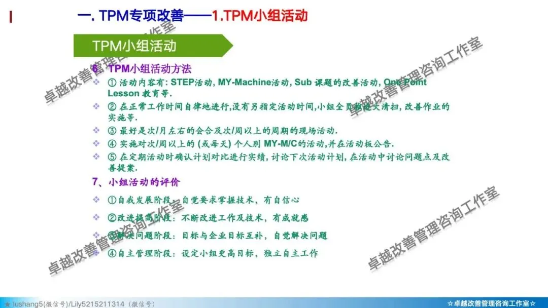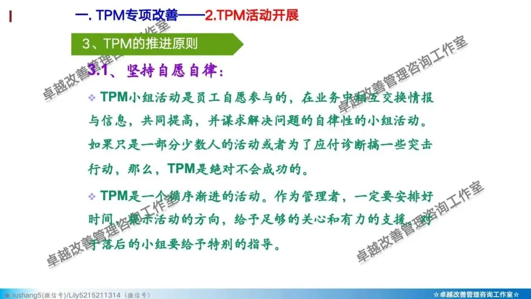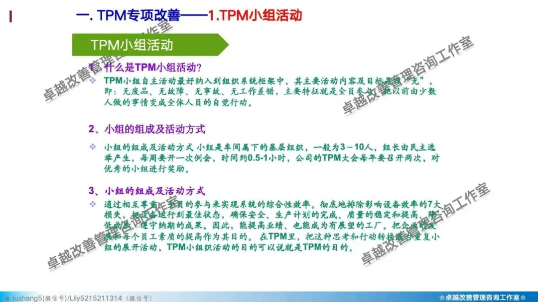 · 与自主保养的区别:自主保养侧重于操作员日常维护,维持基本状态;而个别改善侧重于专业团队针对复杂问题,进行技术改造。