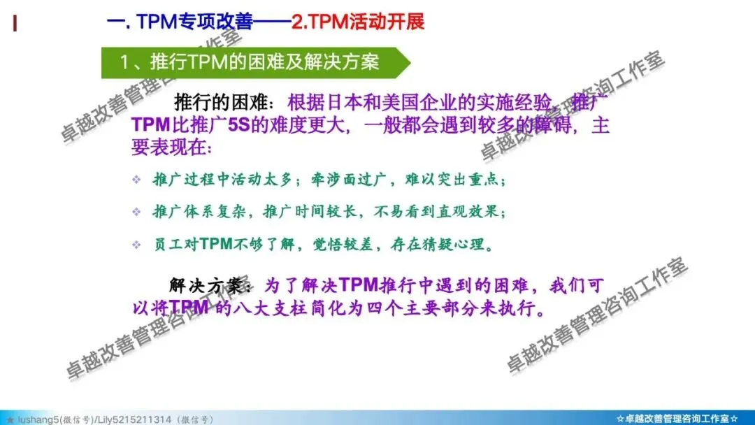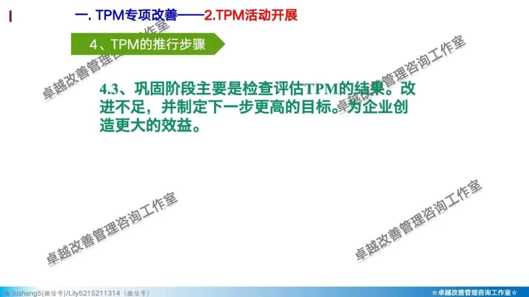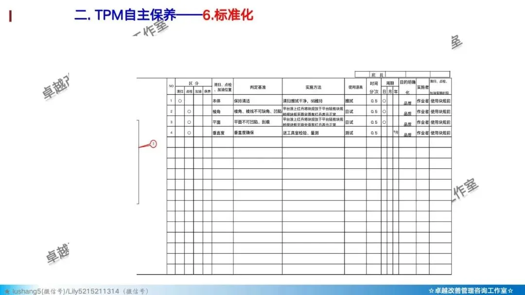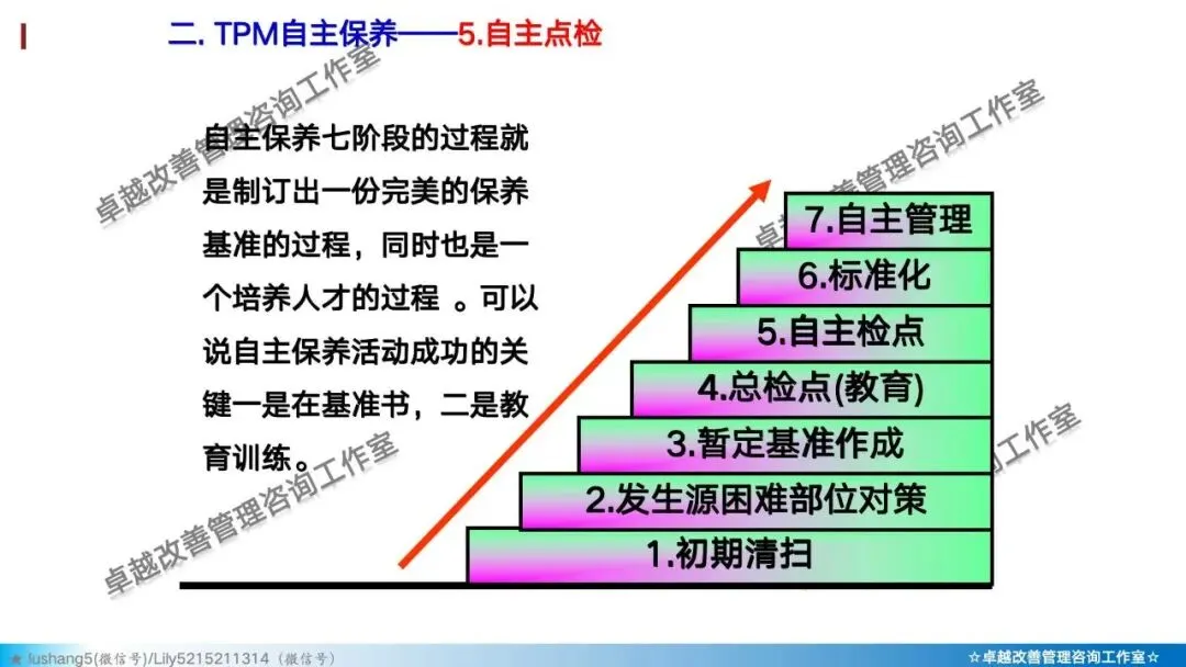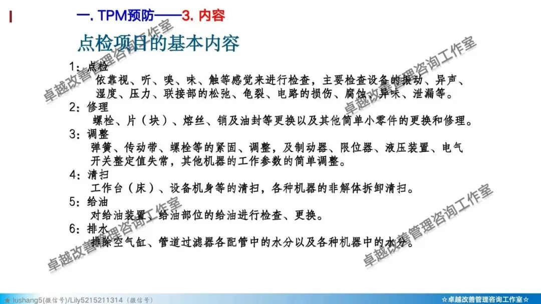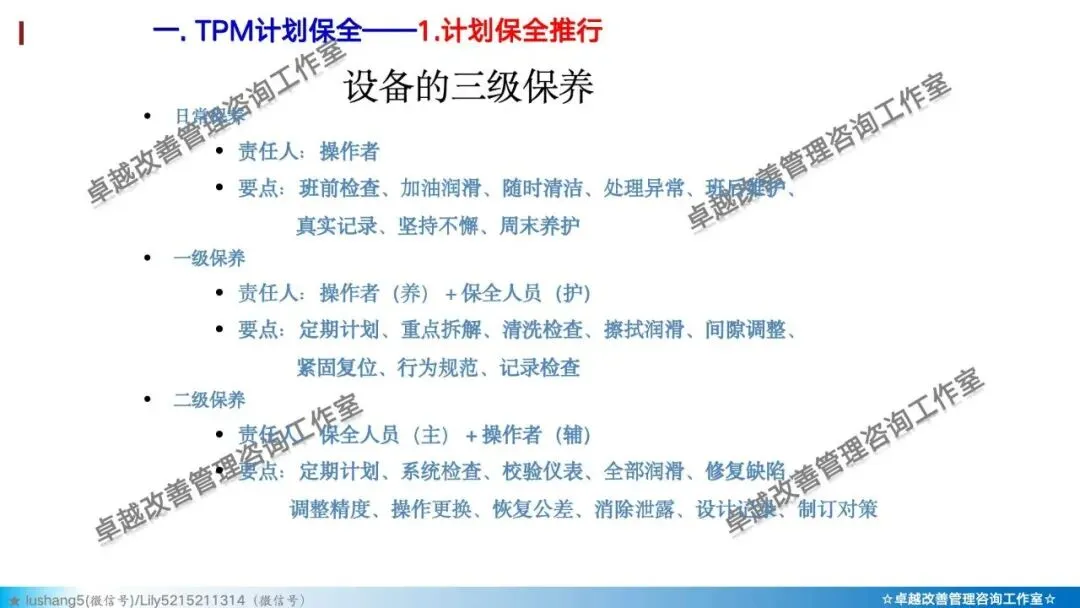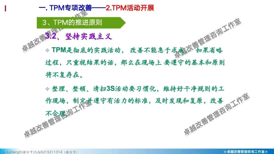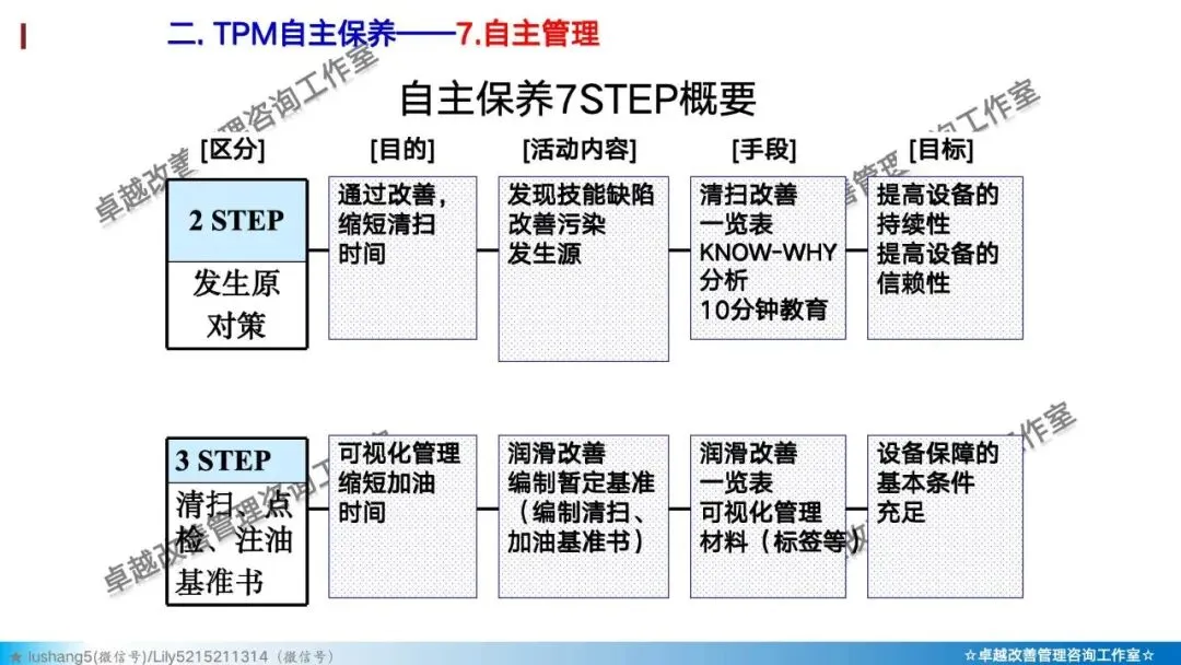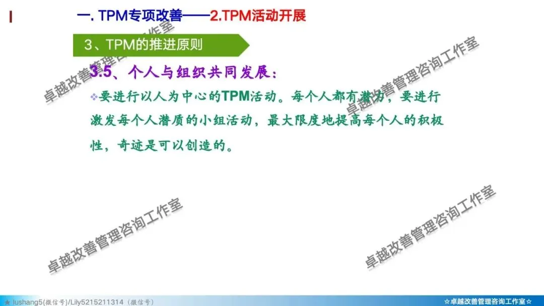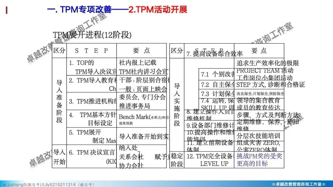· 与自主保养的区别:自主保养侧重于操作员日常维护,维持基本状态;而个别改善侧重于专业团队针对复杂问题,进行技术改造。