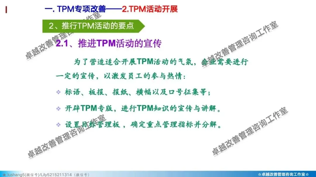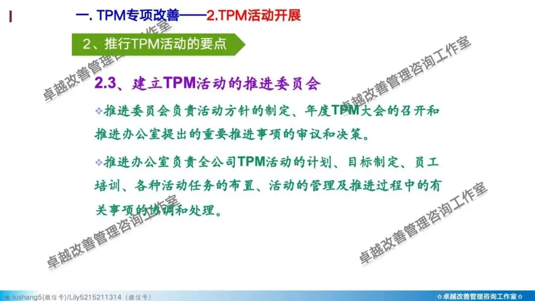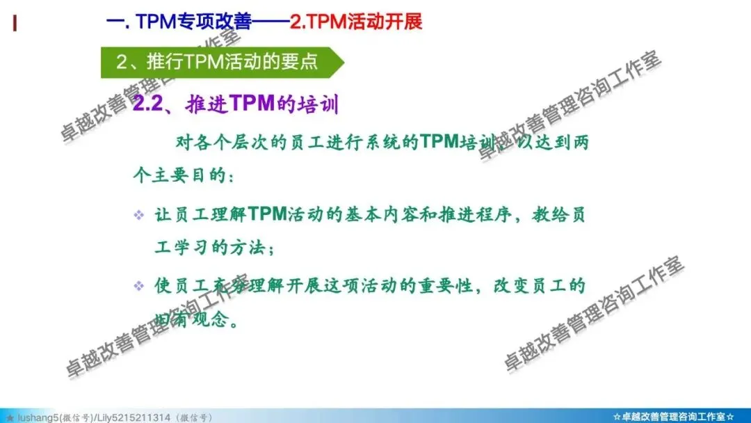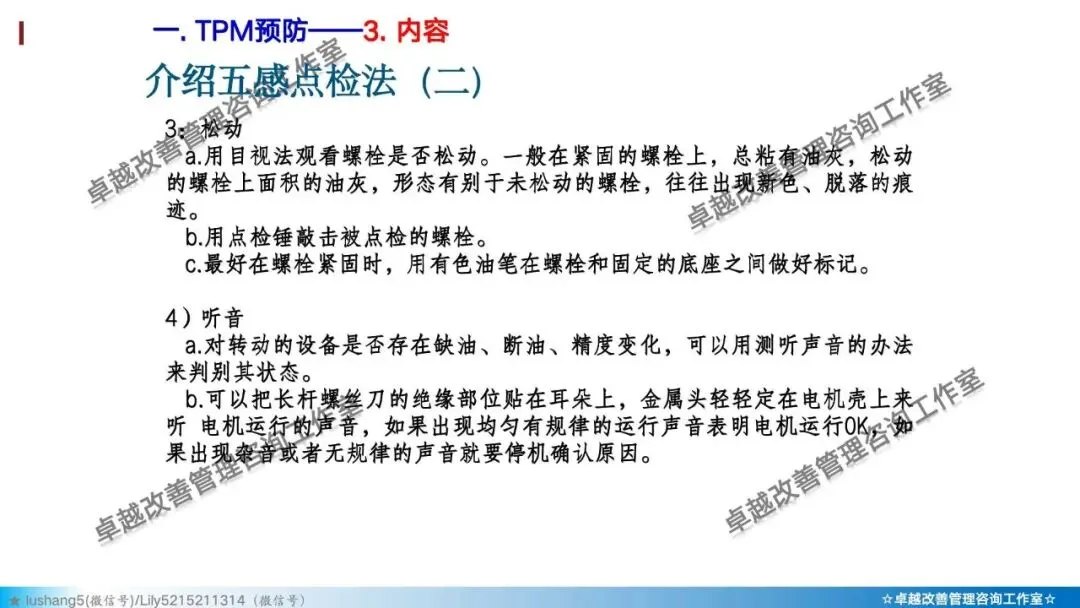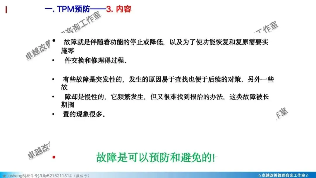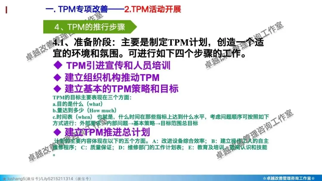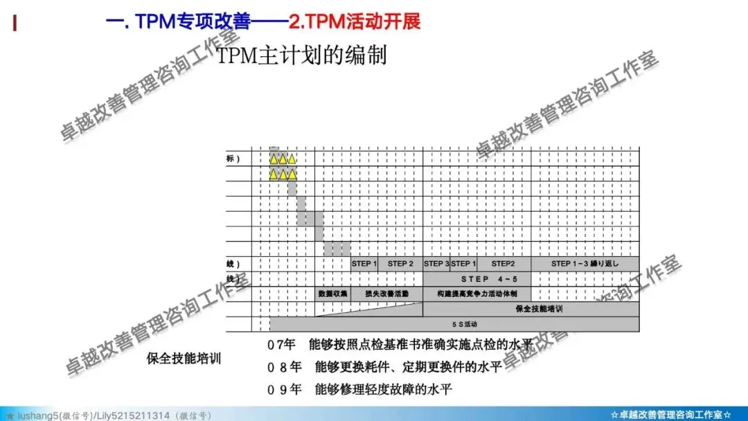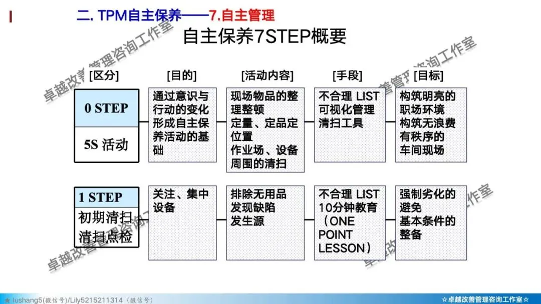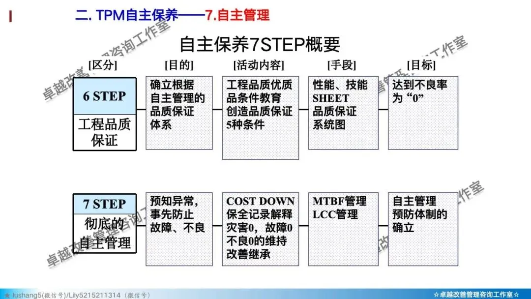 · 与自主保养的区别:自主保养侧重于操作员日常维护,维持基本状态;而个别改善侧重于专业团队针对复杂问题,进行技术改造。
