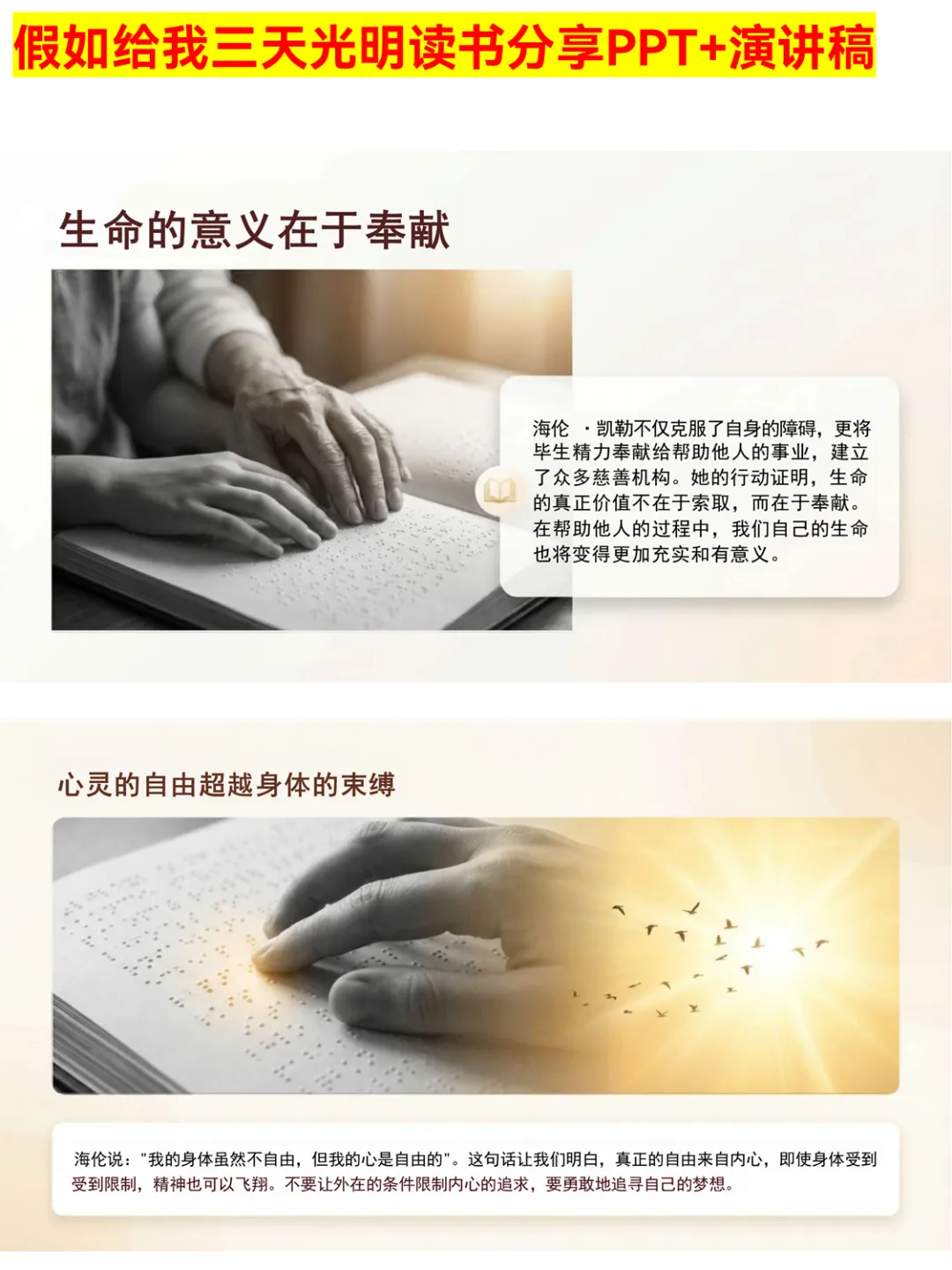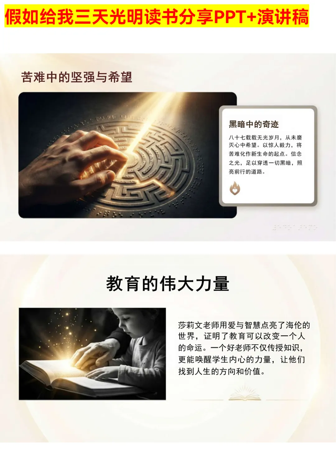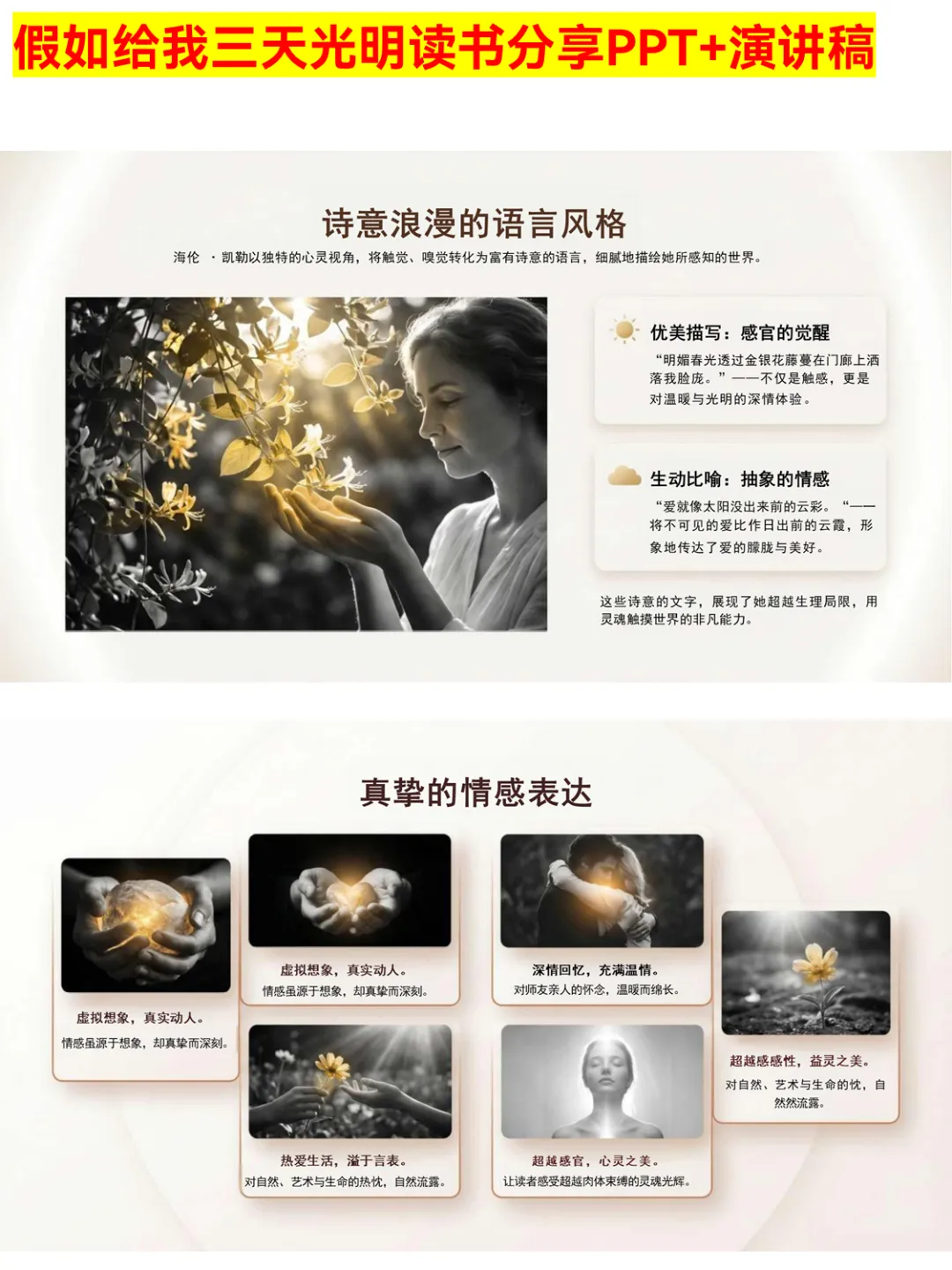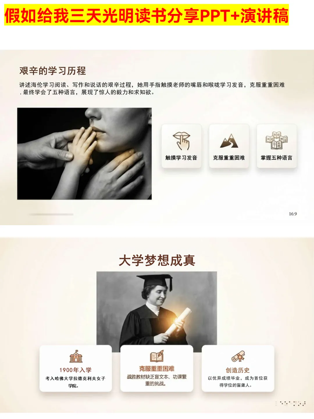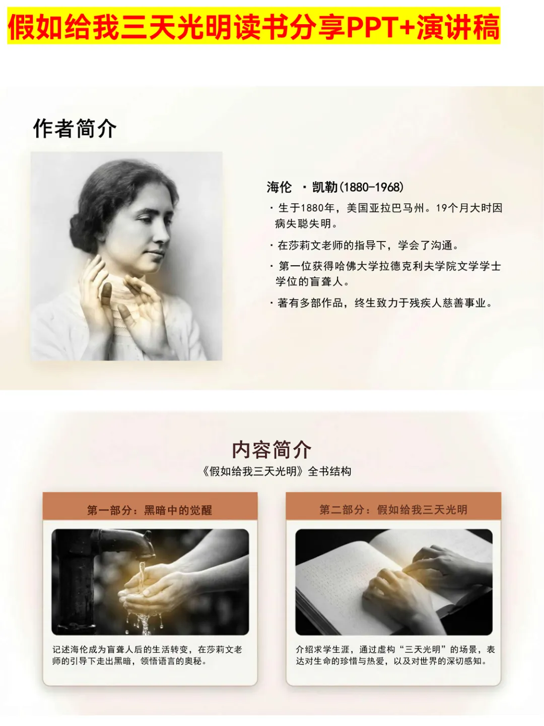 海伦·凯勒的传奇人生太震撼!19个月失聪失明,却在莎莉文老师指引下,解锁语言奥秘、考入哈佛,成为首位获文学学士学位的盲聋人。PPT从作者简介、内容结构到阅读赏析、人生感悟全涵盖,虚构的三天光明场景满是对生命的热爱,还拆解了对比、想象等写作手法,不管是学生读书分享还是自我感悟,都能从中汲取力量。 #假如给我三天光明 #读书分享PPT #海伦凯勒 #经典名著 #阅读感悟 #生命力量 #学习课件 #文学赏析 #励志书籍 #读书推荐