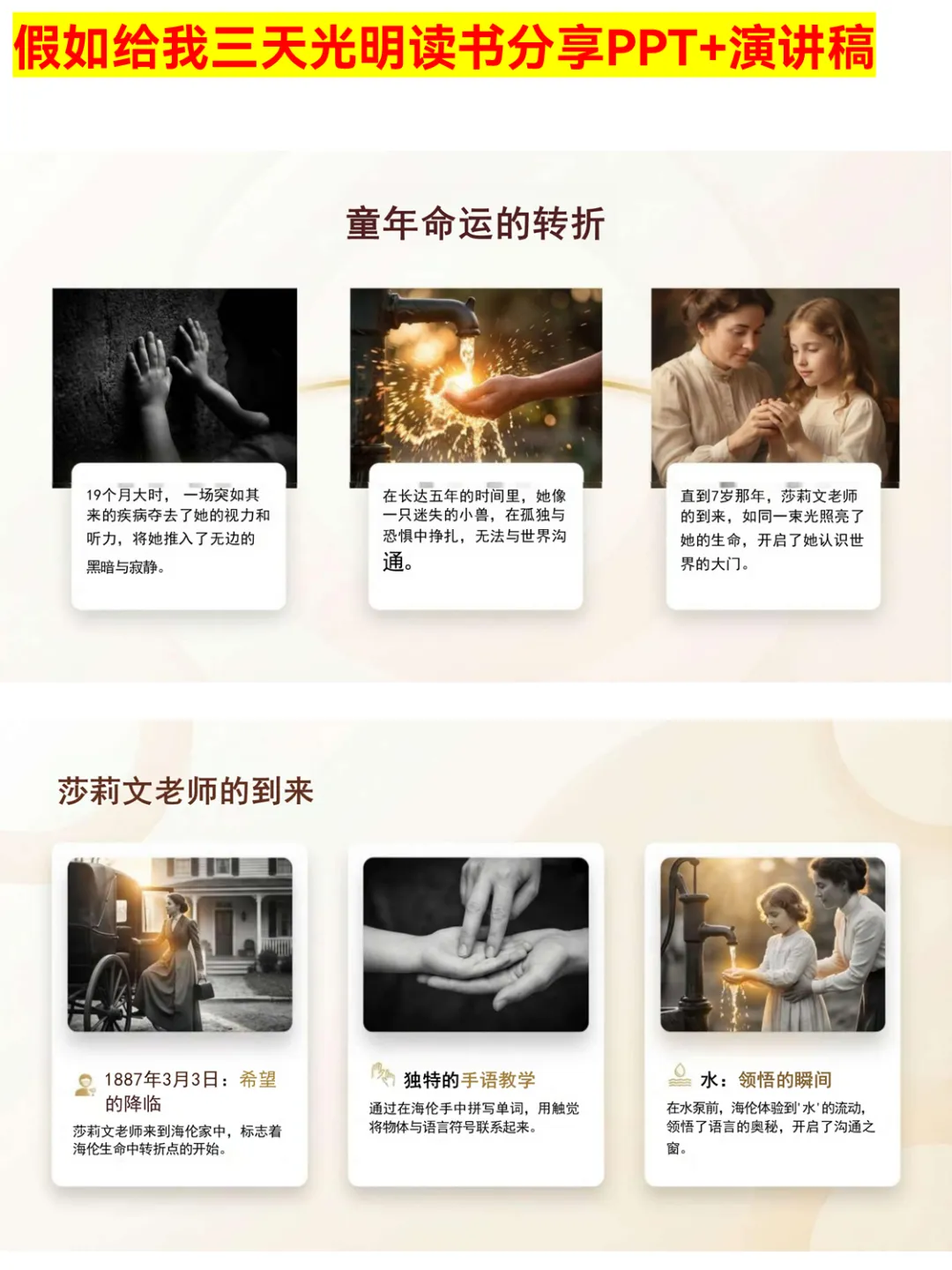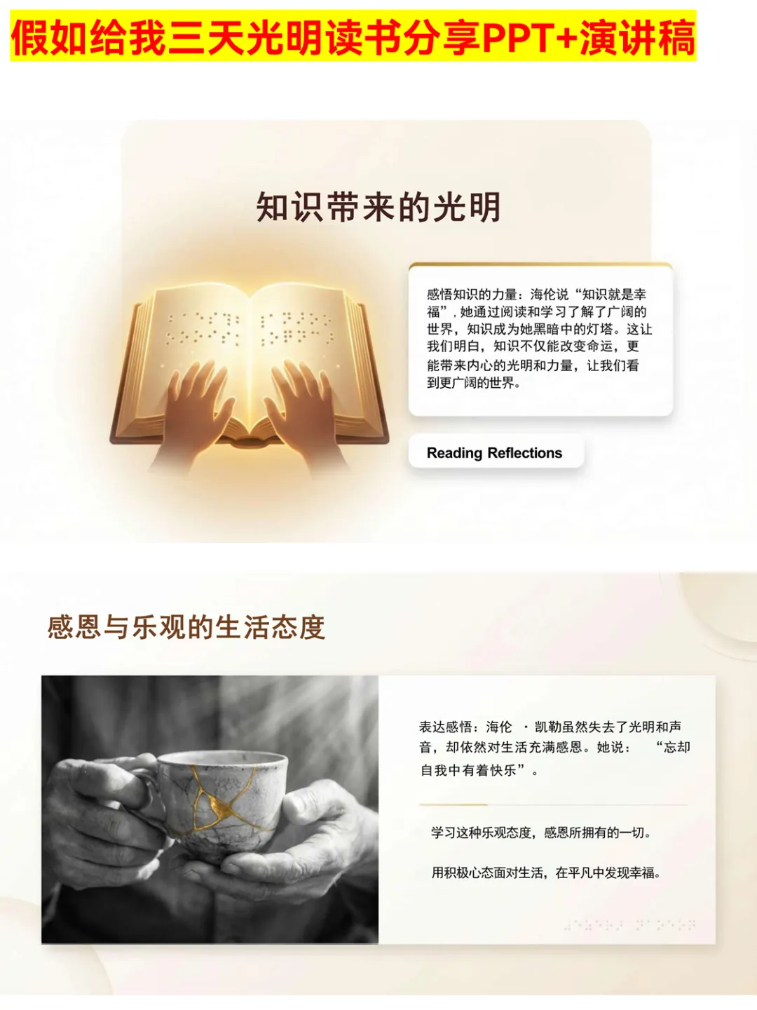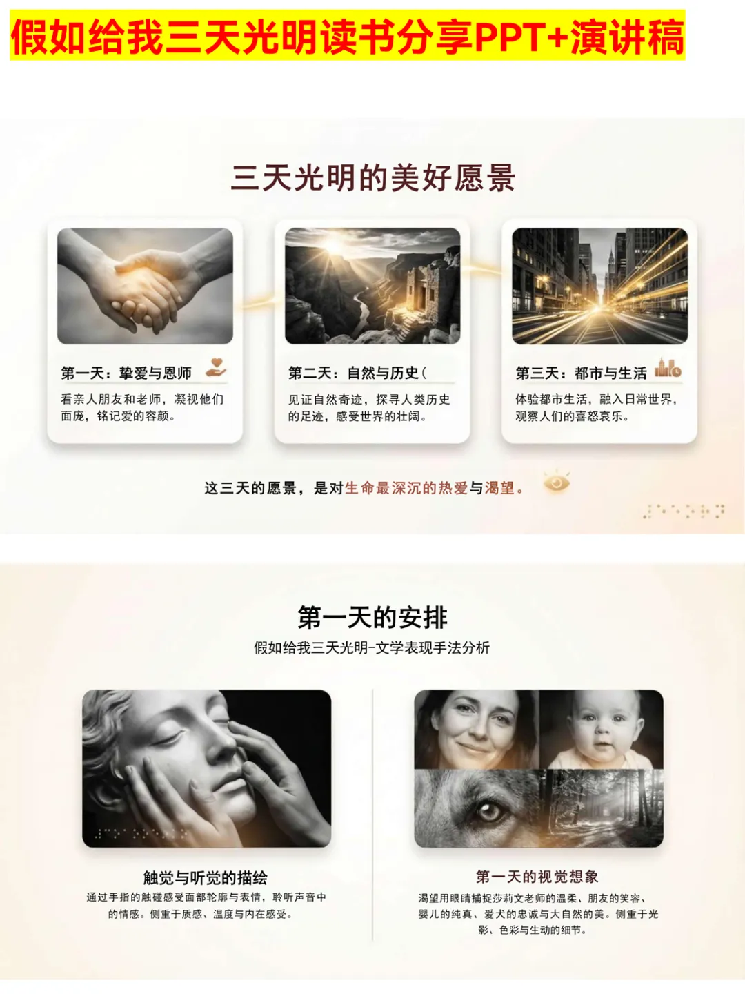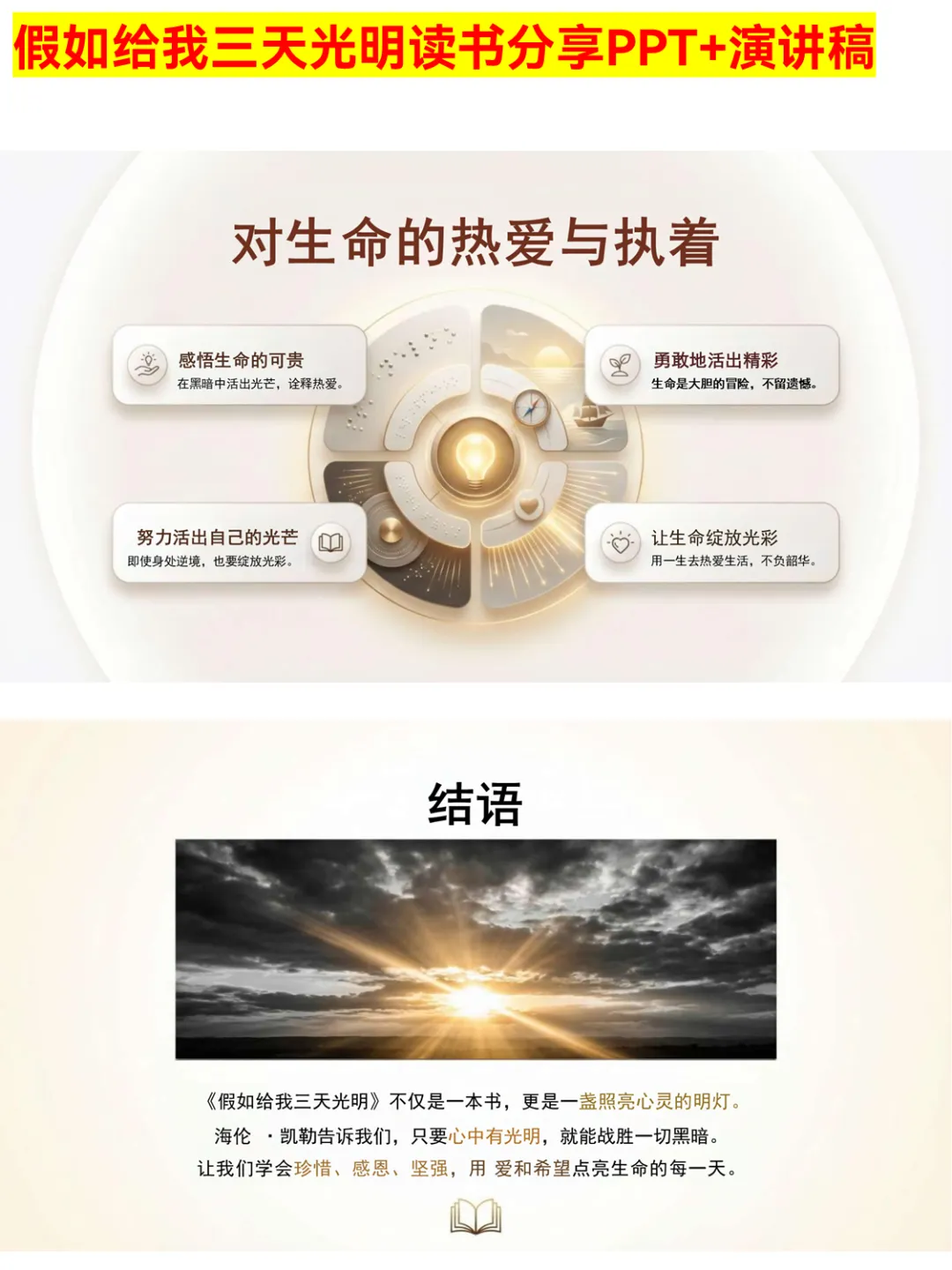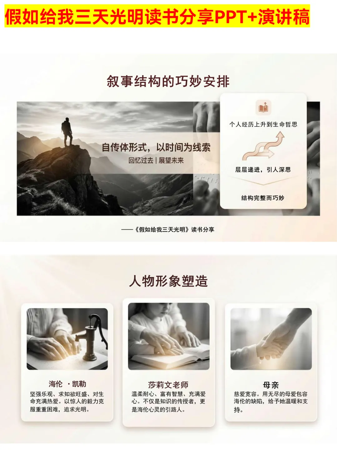海伦·凯勒的传奇人生太震撼!19个月失聪失明,却在莎莉文老师指引下,解锁语言奥秘、考入哈佛,成为首位获文学学士学位的盲聋人。PPT从作者简介、内容结构到阅读赏析、人生感悟全涵盖,虚构的三天光明场景满是对生命的热爱,还拆解了对比、想象等写作手法,不管是学生读书分享还是自我感悟,都能从中汲取力量。 #假如给我三天光明 #读书分享PPT #海伦凯勒 #经典名著 #阅读感悟 #生命力量 #学习课件 #文学赏析 #励志书籍 #读书推荐