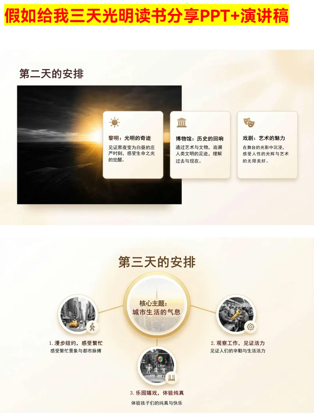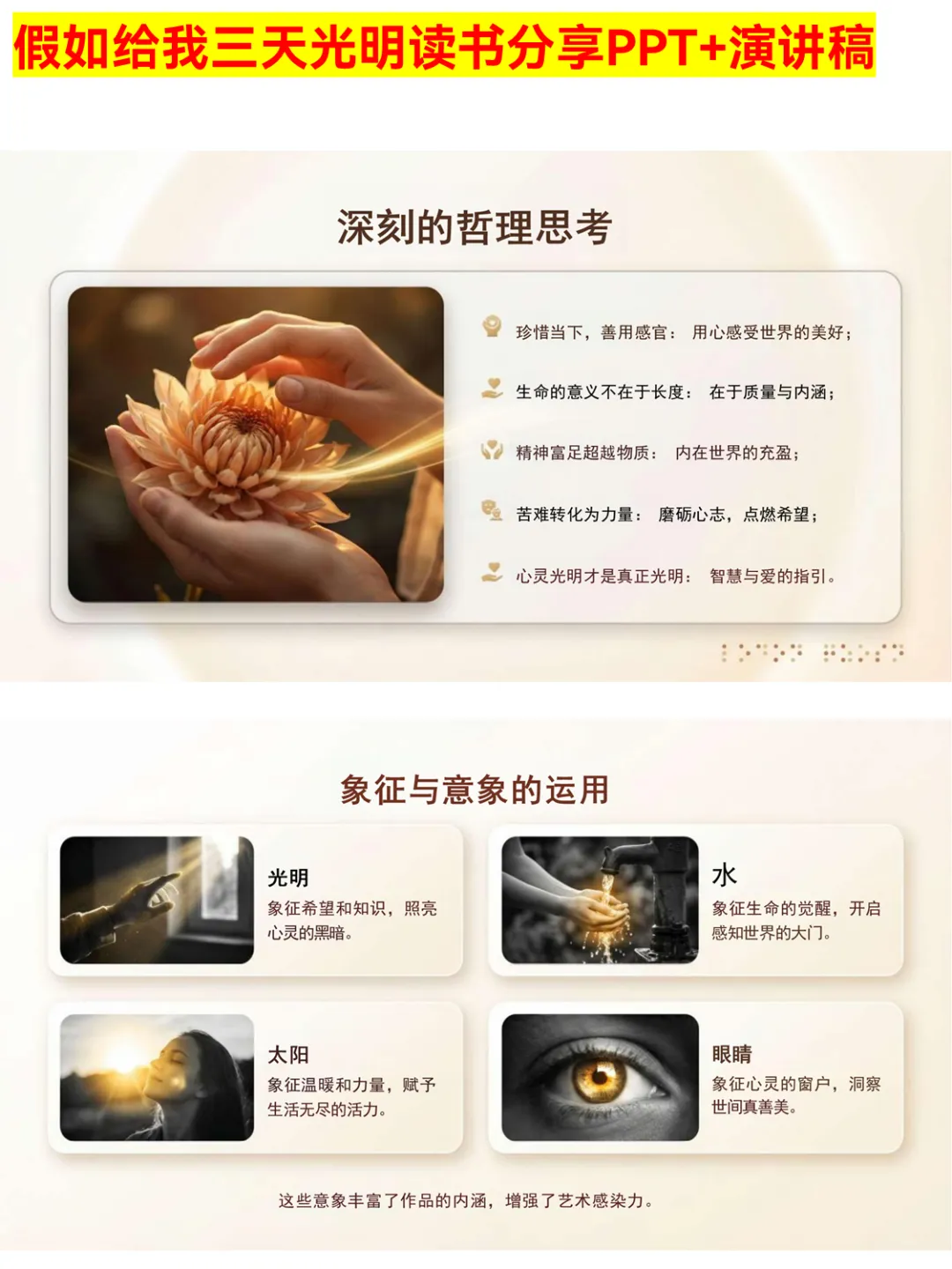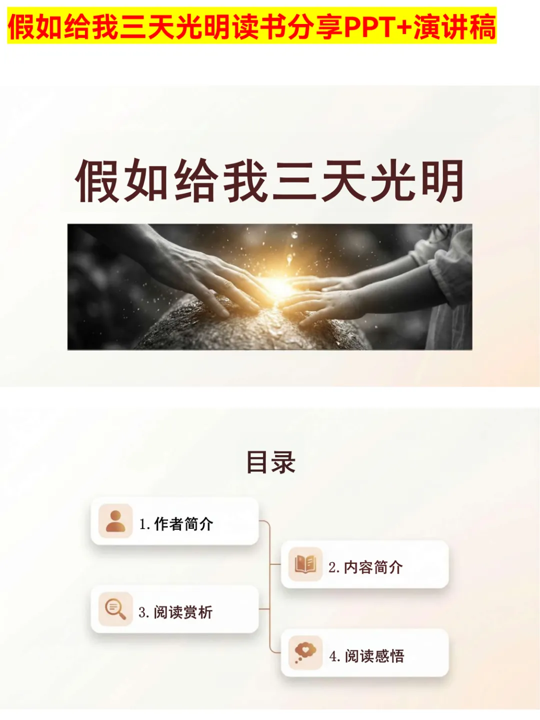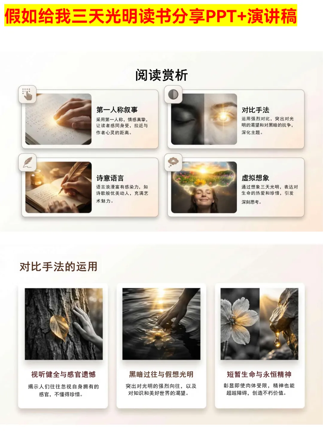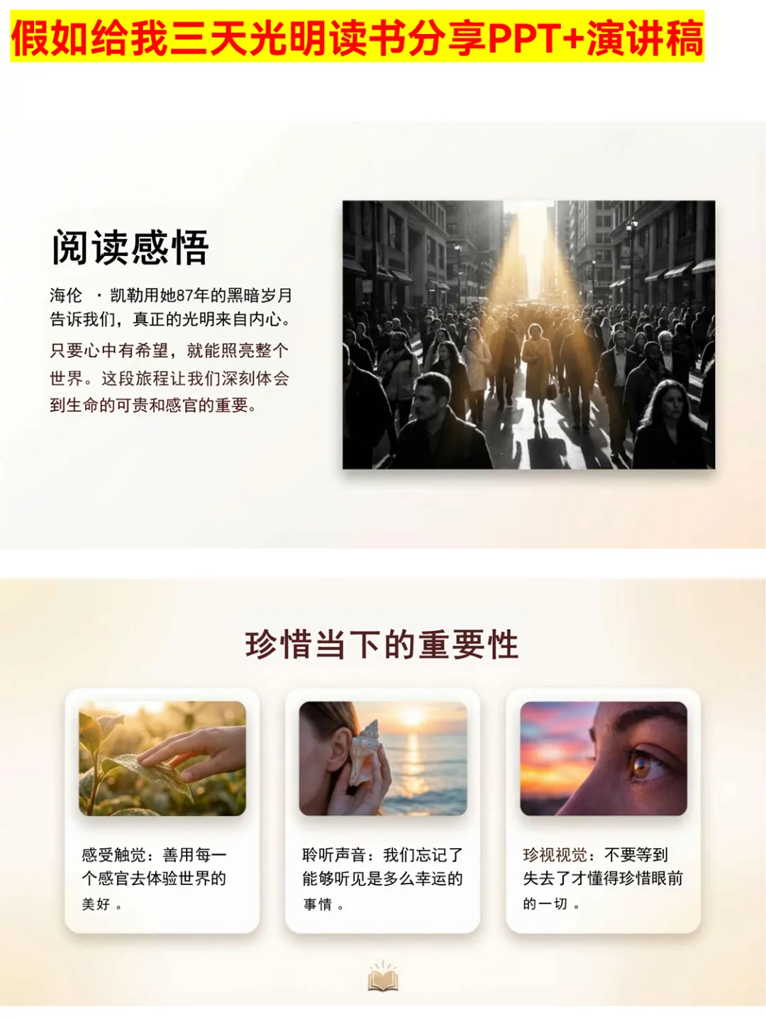 海伦·凯勒的传奇人生太震撼!19个月失聪失明,却在莎莉文老师指引下,解锁语言奥秘、考入哈佛,成为首位获文学学士学位的盲聋人。PPT从作者简介、内容结构到阅读赏析、人生感悟全涵盖,虚构的三天光明场景满是对生命的热爱,还拆解了对比、想象等写作手法,不管是学生读书分享还是自我感悟,都能从中汲取力量。 #假如给我三天光明 #读书分享PPT #海伦凯勒 #经典名著 #阅读感悟 #生命力量 #学习课件 #文学赏析 #励志书籍 #读书推荐