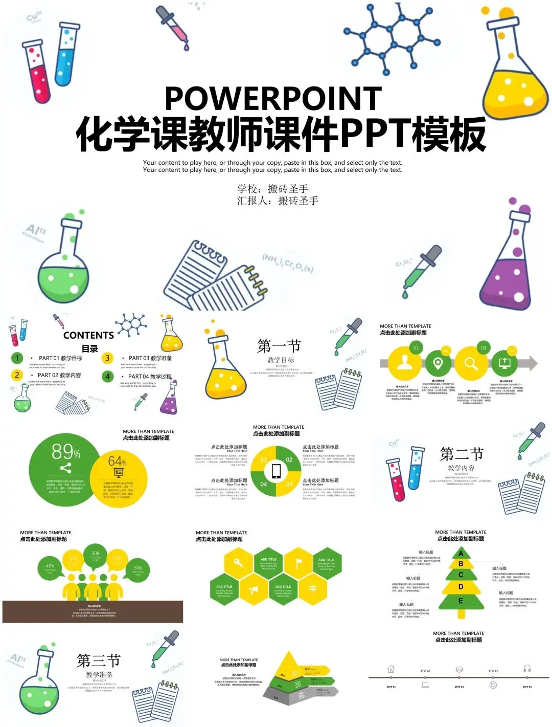 从分子结构3D动态演示到实验数据渐变色谱,从化学史时间轴到危险试剂警示——这套【实验室视觉工具】采用反应釜灵感设计,让枯燥的化学公式绽放出晶体般的光彩。(文末扫码免费下载)