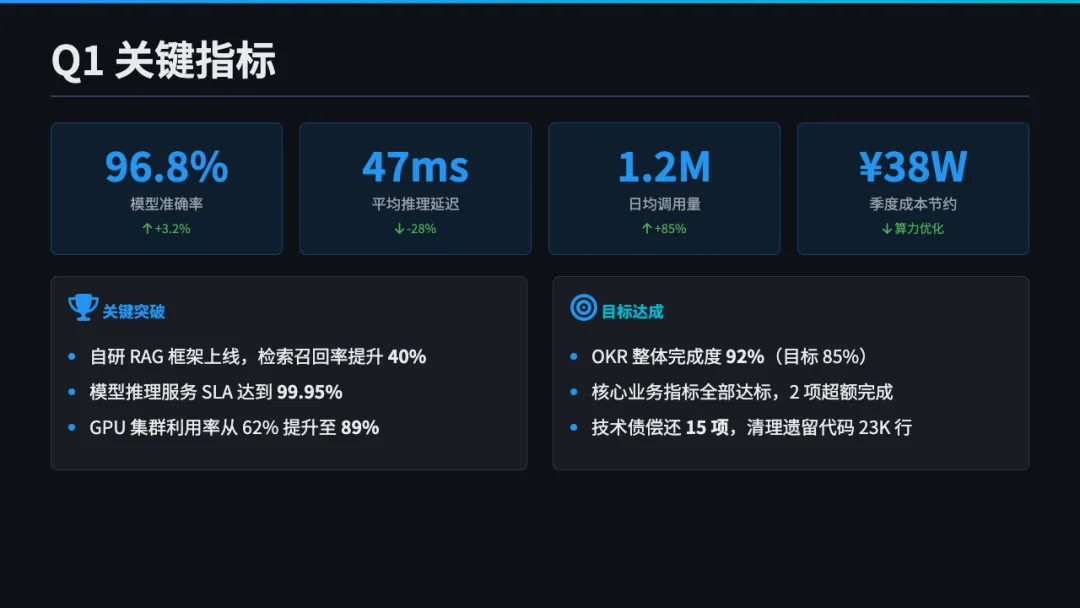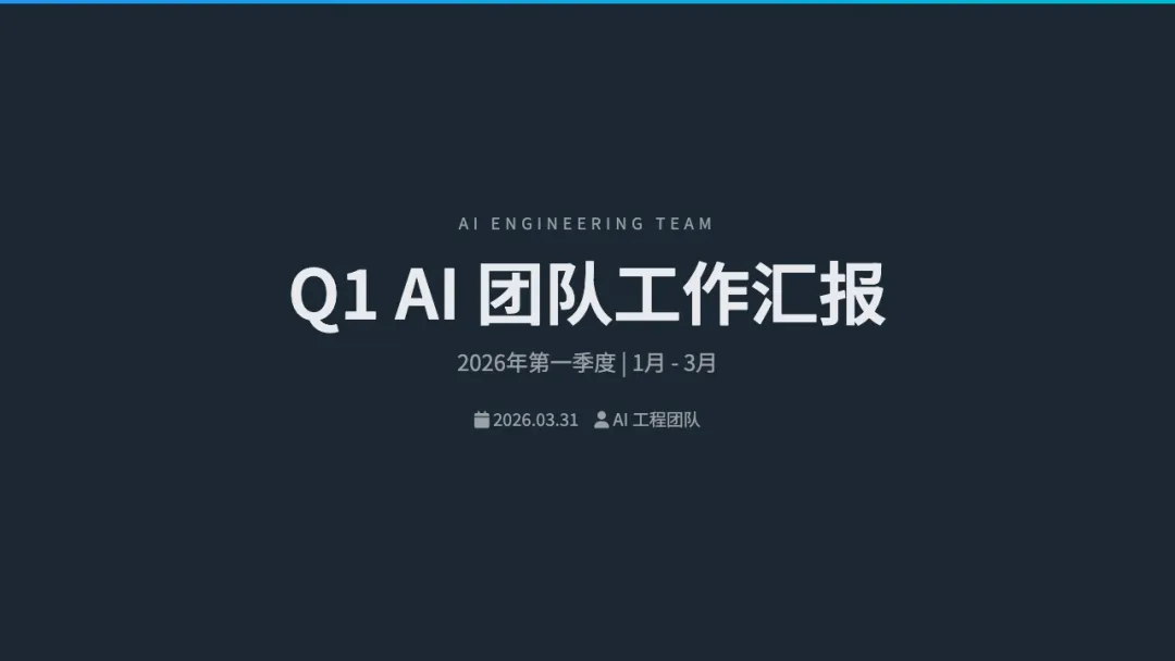 为了让大家直观感受差异,我用同一个主题——"Q1 AI 团队工作汇报",分别用三个 Skill 各做了一版。下面挨个说效果。