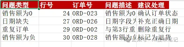 检查数据质量:去重(按订单号)、识别空值/异常值(销售额为 0、负数、日期缺失),并在“Data_Check”表输出问题清单(问题类型、行号、订单号、建议处理)。