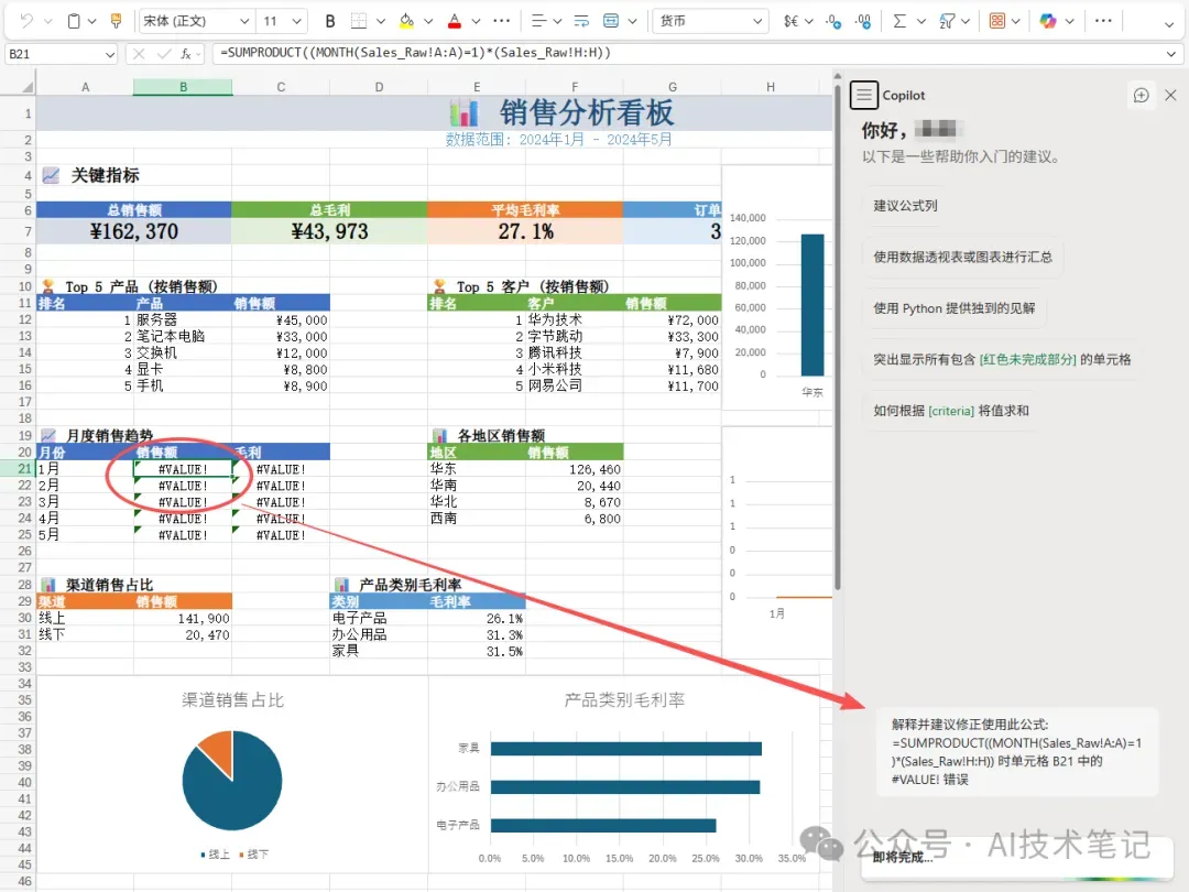 点击后,copilot会帮助你分析错误原因,给出准确公式,并自动修复这个错误: