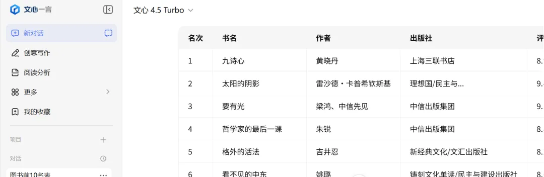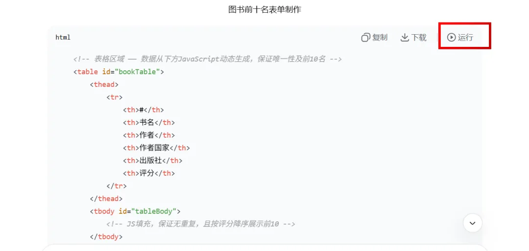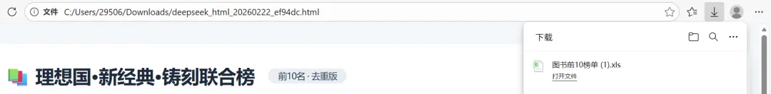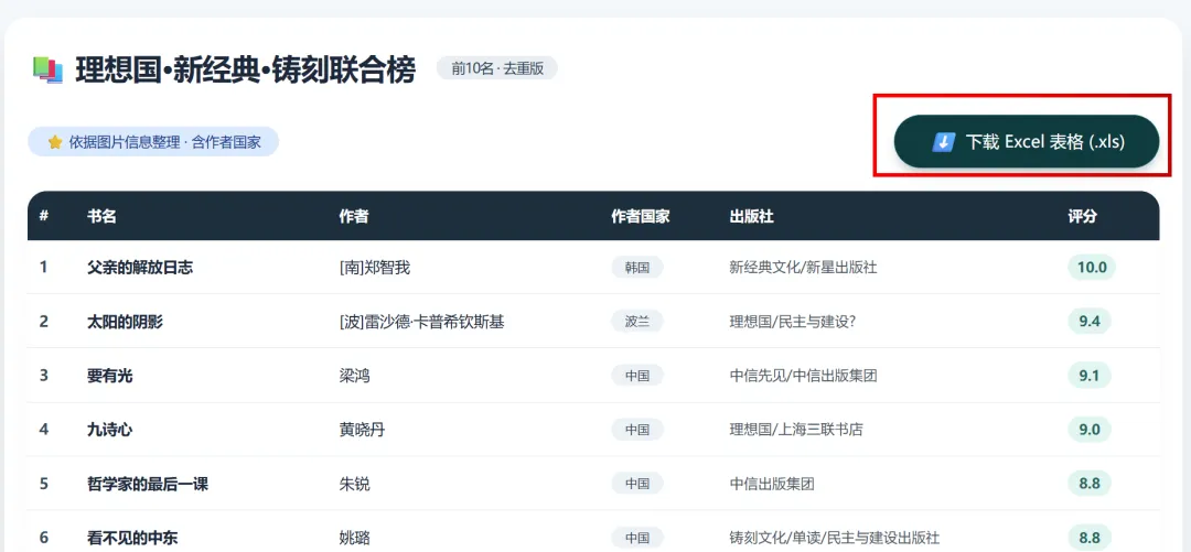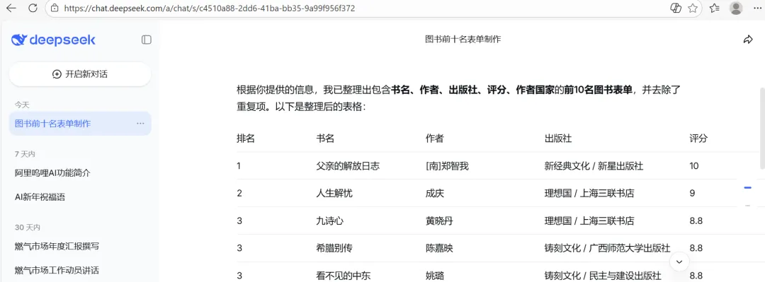 普通人如何先用起来,如果你是办公人员,你可能已经用上了,那是帮你整理写文案、总结等,但是你有没有让AI帮你整理关于Excel数据,提效也是飞速的。1、让AI帮你整理网络数据,做表格。当你的老板给你一个网页地址,让你用五分钟整理出来数据表格,这时候你还要一点点的整理数据,再画表格,那就太慢了,看例子:五分钟整理出来网页图片中2025年度图书。找个你熟悉的AI大模型,把图片给它,提示词:你是一名表格制作的高手,善于从文字信息中提取关键信息并制作成表格,请根据以下信息,帮我制作出一份图书的前10名表单,包含书名,作者,出版社,评分,作者国家,去除掉重复信息,请以表格的方式呈现给我。如果存成Excel版,你需要复制网页中的表格,复制到Excel文件中即可。一定要举一反三呀。可以直接复制表格存放到Excel文件中,或者在提示词中加上一句话,可以直接生成下载按钮,省去复制步骤,直接生成Excel文件,提示词如下:你是一名表格制作的高手,善于从文字信息中提取关键信息并制作成表格,请根据以下信息,帮我制作出一份图书的前10名表单,包含书名,作者,出版社,评分,作者国家,去除掉重复信息,以html格式输出,要能直接在页面成功下载Excel文件,并且有下载Excel文档的按钮。正常操作2分钟左右,剩下时间还可以美化一下表格,AI时代了来临,别先想着以前的方法,看看AI能帮我做什么更提效,快去试试吧!!!