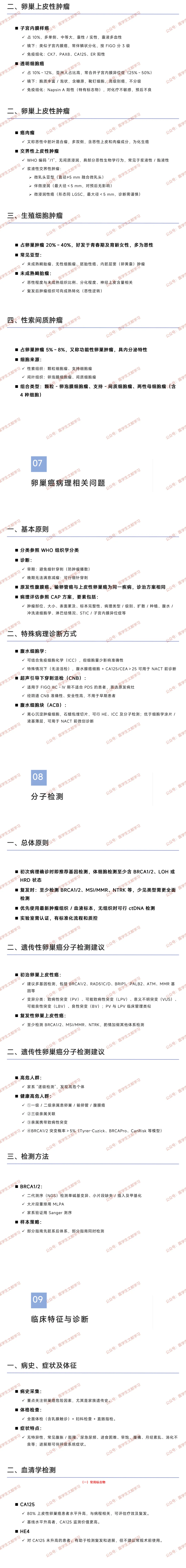 参照 WHO 分类和 CAP 方案评估,早期避免细针穿刺,晚期可行;原发性腹膜癌、输卵管癌与上皮性卵巢癌诊治方案相同。
