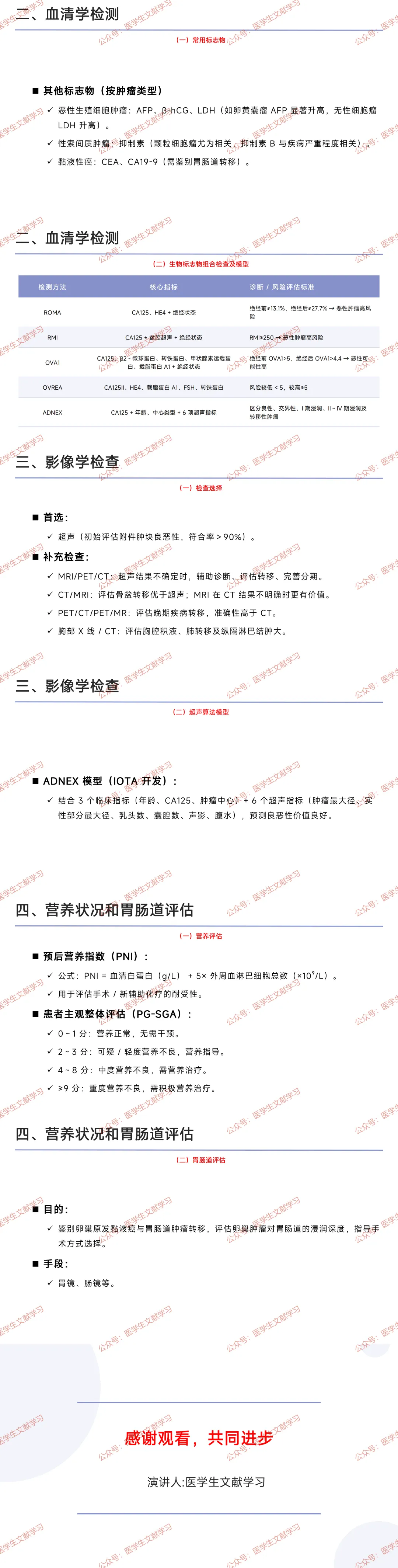 - 首选超声评估附件肿块良恶性,MRI/PET/CT 等为补充,用于辅助诊断、评估转移和完善分期。