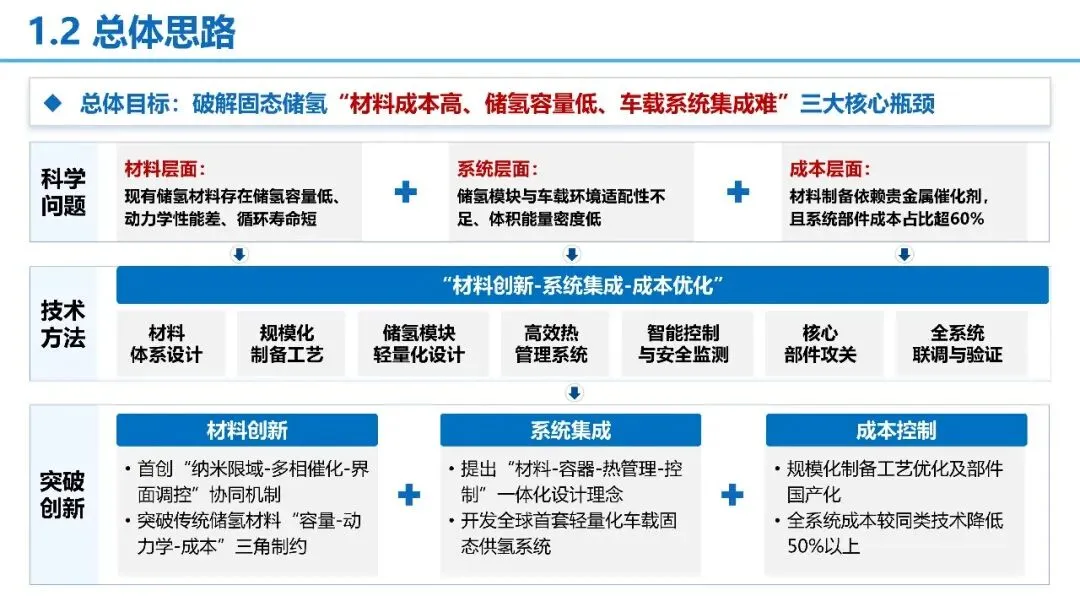 本项目是冲击科学技术进步奖的核心答辩成果,聚焦车载固态储氢领域的产业化瓶颈,针对传统储氢技术成本高、储氢容量低、车载系统集成难等痛点,以 “材料创新 - 系统集成 - 成本优化” 为核心路径,突破固态储氢材料与车载供氢系统的关键技术,破解氢能在交通领域规模化应用的核心障碍,为我国氢能产业高质量发展提供核心支撑。