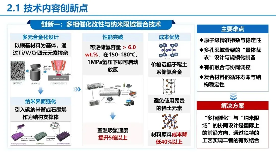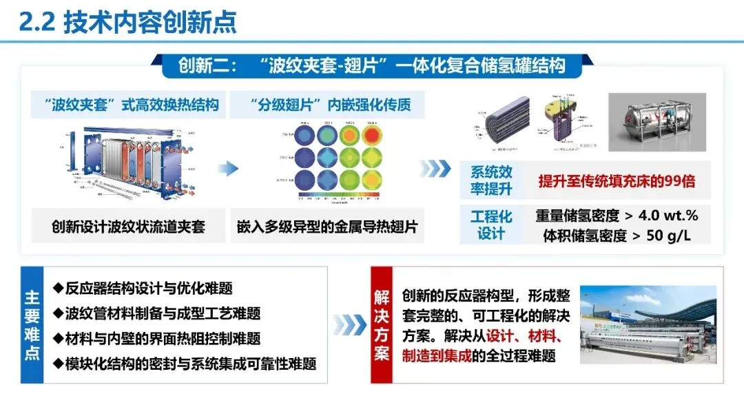 材料层面创新:首创多相催化改性与纳米限域复合技术,以镁基材料为基体,通过多元合金化设计与纳米界面强化,实现可逆储氢容量>6.0 wt.%,室温吸氢速度提升 5 倍以上,同时规避稀土元素使用,材料原料成本降低 40% 以上,突破传统储氢材料 “容量 - 动力学 - 成本” 的三角制约。系统层面创新:研发 “波纹夹套 - 翅片” 一体化复合储氢罐结构,通过高效换热结构设计与强化传质优化,使系统效率提升至传统填充床的 99 倍,重量储氢密度≥4.0 wt.%、体积储氢密度≥50 g/L,破解反应器设计、材料成型、系统集成等全流程工程难题。四、评价