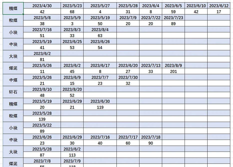 日期横向排列,一眼看过去密密麻麻; 数据结构诡异,每个产品名称后面紧跟着两行数据(一行日期,一行数值); 没有标准表头,根本没法直接做透视表或图表。
