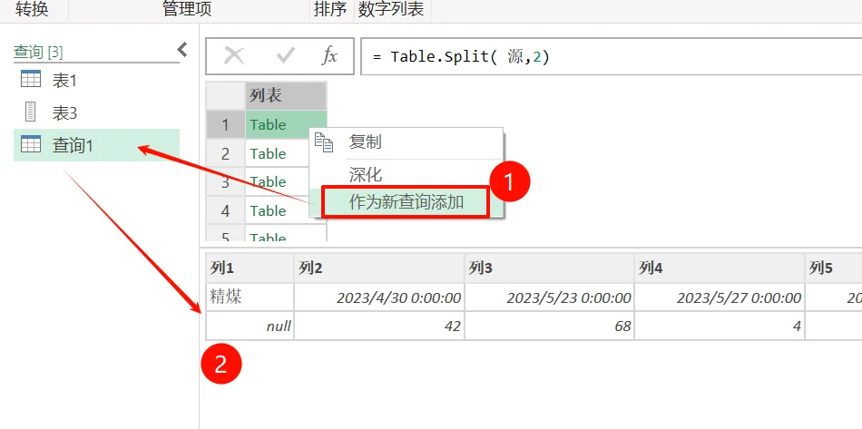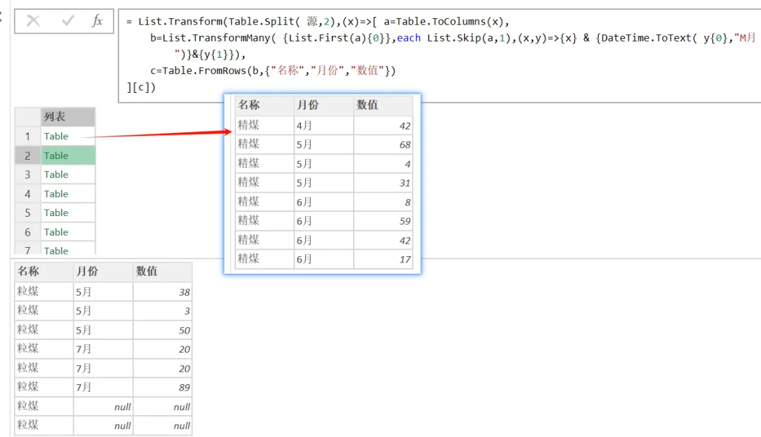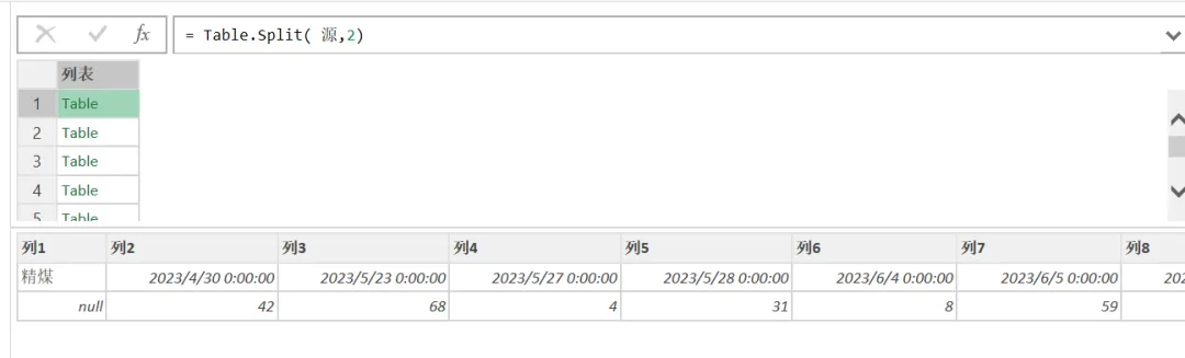 数据的规律是每两行为一组,所以先用Table.Split将数据拆分开