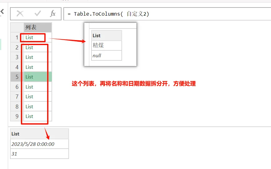 将子表格的数据,按列转为list。这里不进行转置或提升标题的原因是,第1列的名称不是固定的值,考虑到要批量处理其他表格,这里不能简单的转置。