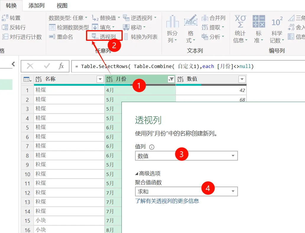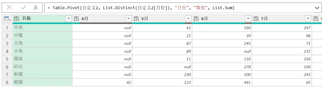 最后,再将月份透视回去,转为二维表样式,并按数值进行求和,就得到了所需要的结果