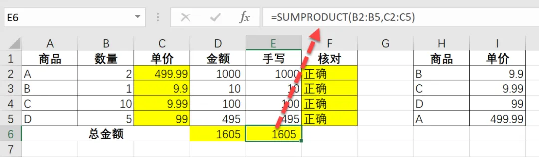 =SUMPRODUCT(B2:B5,C2:C5)