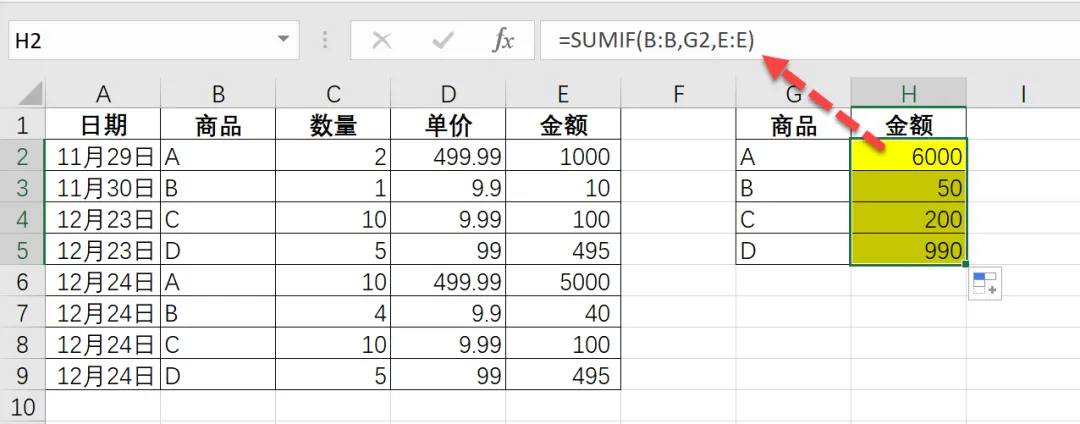 =SUMIF(B:B,G2,E:E)