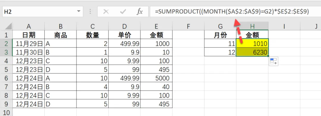 =SUMPRODUCT((MONTH($A$2:$A$9)=G2)*$E$2:$E$9)