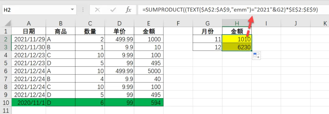 =SUMPRODUCT((TEXT($A$2:$A$9,"emm")="2021"&G2)*$E$2:$E$9)