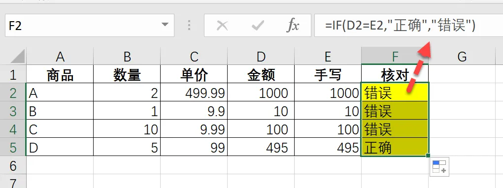 =IF(D2=E2,"正确","错误")