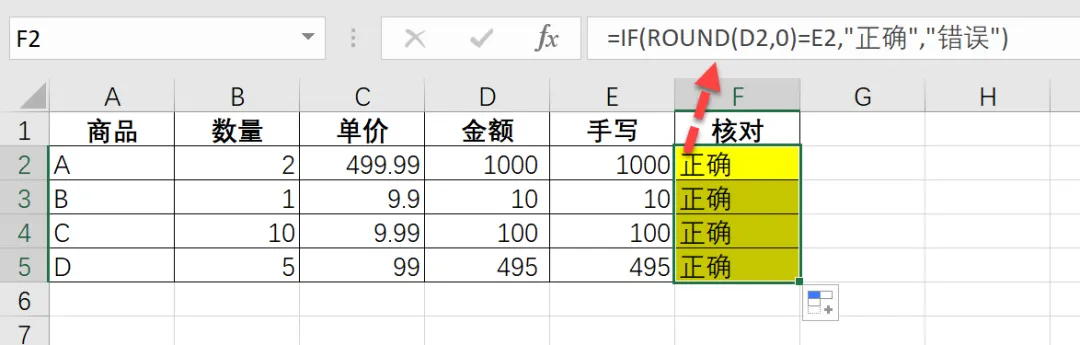 =IF(ROUND(D2,0)=E2,"正确","错误")