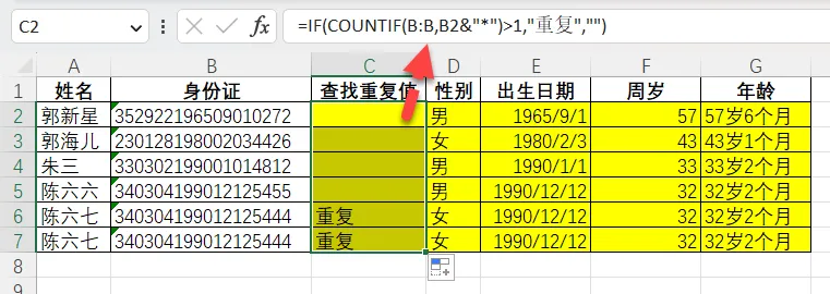 =IF(COUNTIF(B:B,B2&"*")>1,"重复","")