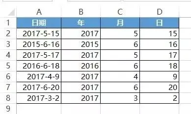 =YEAR(A2) =MONTH(A2) =DAY(A2)
