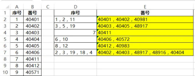 =TEXTJOIN(",",1,IFERROR(VLOOKUP(N(IF({1},--TRIM(MID(SUBSTITUTE(D2,",",REPT(" ",50)),{1,2,3,4,5,6,7,8,9}*50-49,50)))),A:B,2,0),""))