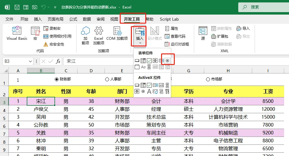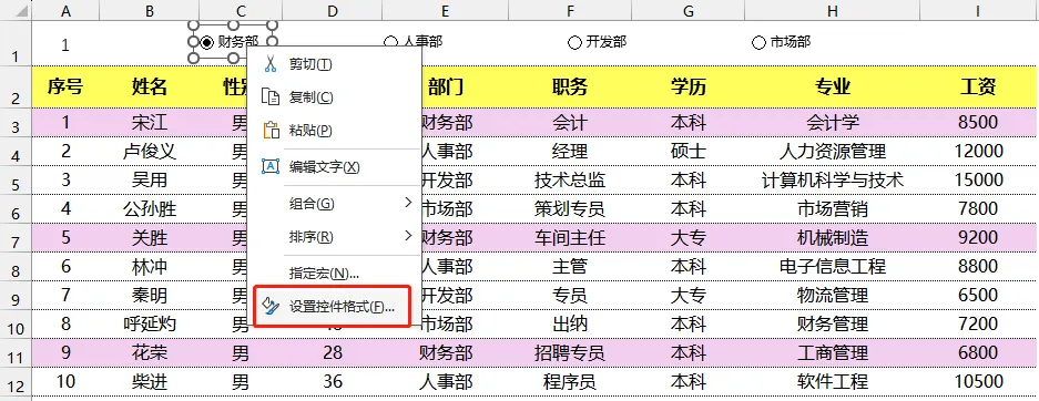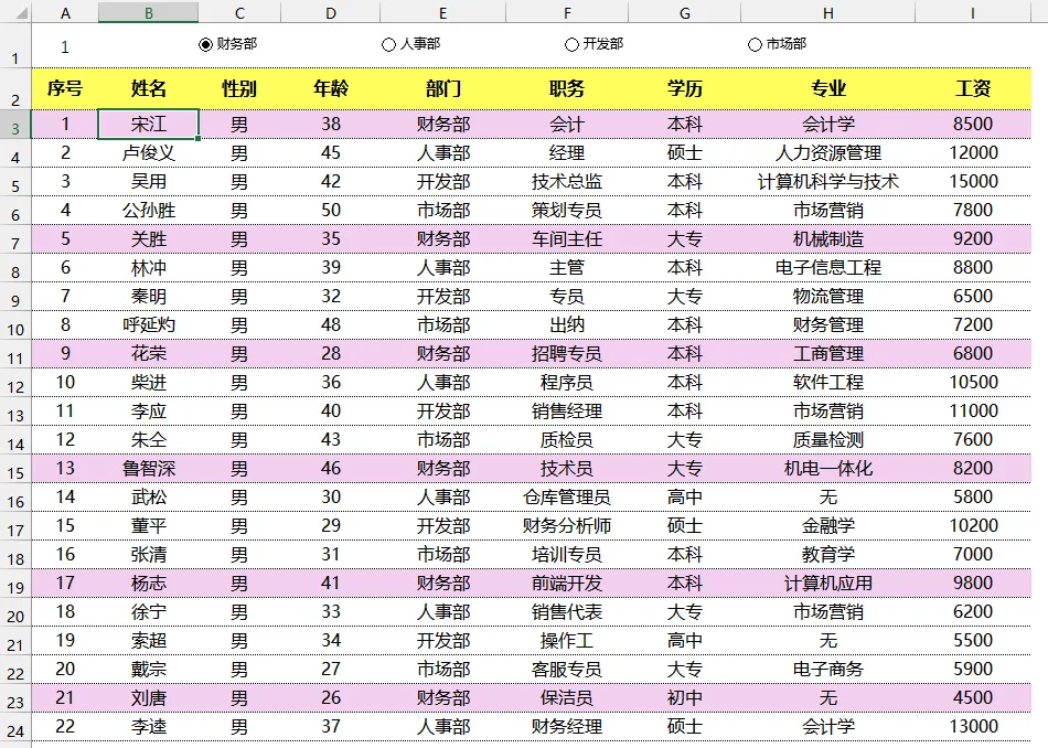 设置完成后,点击对应部门的选项按钮,表格中该部门的所有人员信息会自动高亮显示,其他部门数据保持不变,一目了然,再也不用逐行查找~详细操作步骤