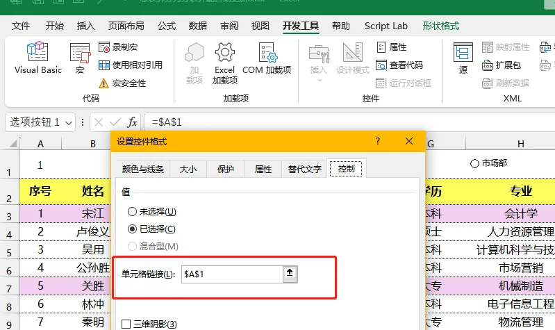 这一步是实现“点击切换”的核心,我们需要插入4个选项按钮,分别对应4个部门,并设置链接单元格,让按钮操作同步反馈到表格中。1.选中表格第一行(数据区域上方的空白行,方便放置选项按钮),点击顶部菜单栏「开发工具」;2.在「开发工具」中找到「插入」,点击下拉菜单,选择「表单控件」里的「选项按钮(窗体控件)」;3.鼠标移动到第一行空白处,点击并拖动,绘制第一个选项按钮,右键点击该按钮,选择「编辑文字」,修改为「财务部」;4.重复步骤3,依次绘制另外3个选项按钮,分别修改文字为「人事部」「开发部」「市场部」,并将4个按钮排列整齐(可拖动调整位置);5.选中任意一个选项按钮,右键点击选择「设置控件格式」;6.在弹出的对话框中,找到「单元格链接」,点击输入框,然后点击表格中的A1单元格(最终显示为$A$1),点击「确定」;此时,点击任意一个选项按钮,A1单元格会显示对应数字(后续会用到这个数字匹配部门)。小贴士:如果找不到「开发工具」,点击顶部菜单栏「文件」→「选项」→「自定义功能区」,在右侧勾选「开发工具」,点击「确定」即可调出。第二步:设置条件格式,实现一键高亮