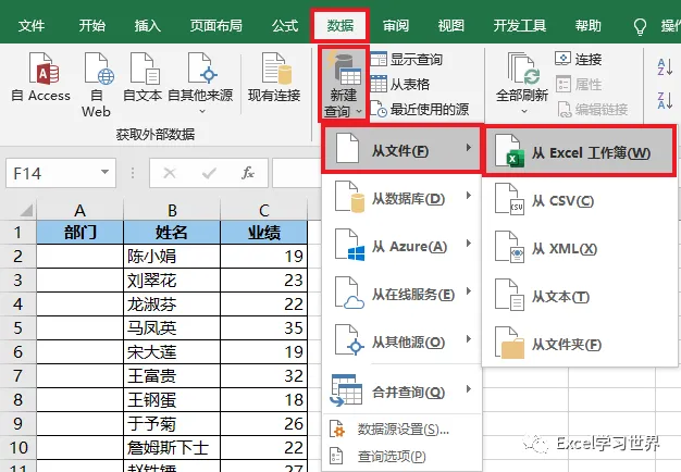 1. 选择菜单栏的“数据”-->“新建查询”-->“从文件”-->“从 Excel 工作簿”