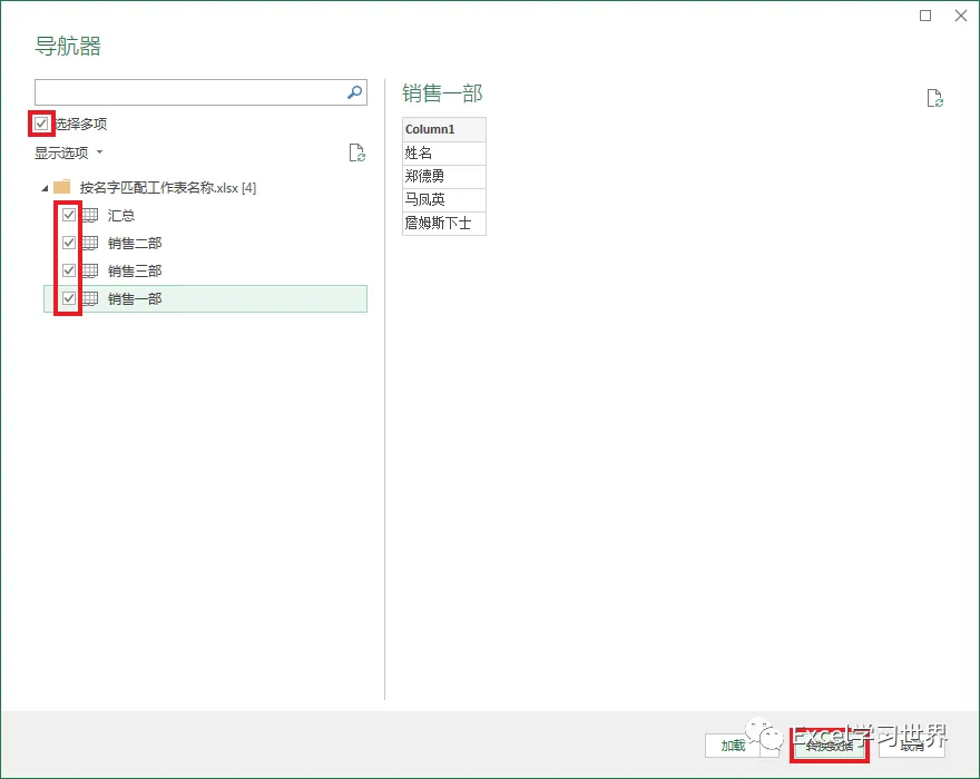 3. 在弹出的对话框中勾选“选择多项”--> 勾选所有工作表 --> 点击“转换数据”