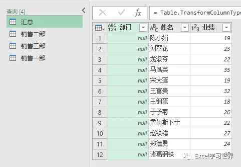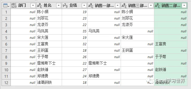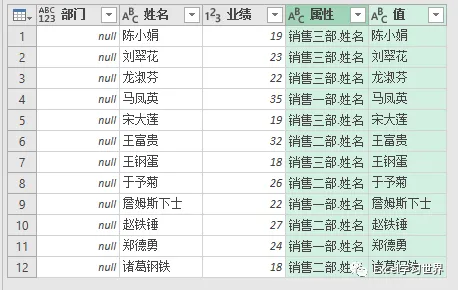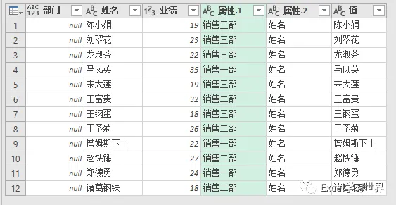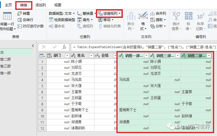 10. 选中三个销售部门列 --> 选择菜单栏的“转换”-->“逆透视列”
