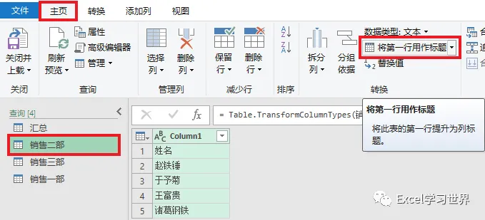 4. 选中第一个分工作表查询 --> 选择“主页”-->“将第一行用作标题”