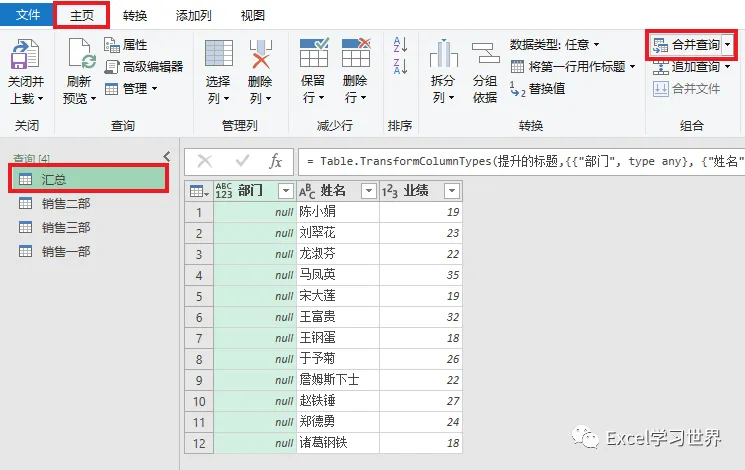 6. 选中“汇总”查询 --> 选择菜单栏的“主页”-->“合并查询”