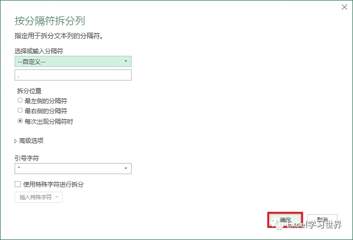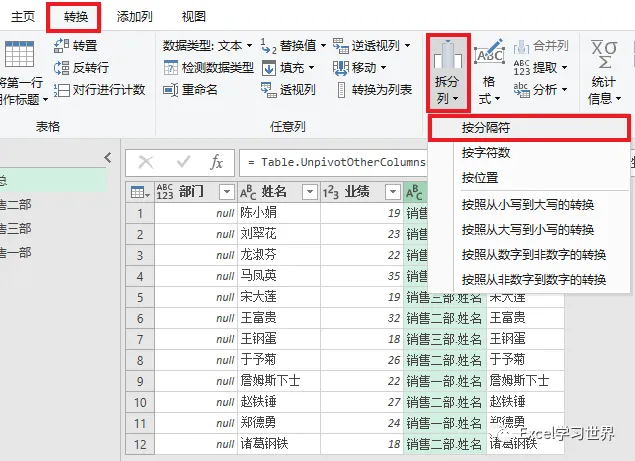 11. 选中“属性”列 --> 选择菜单栏的“转换”-->“拆分列”-->“按分隔符”