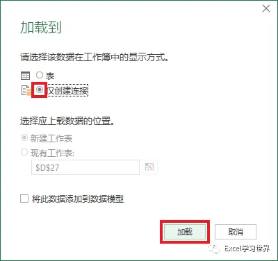 16. 在弹出的对话框中选择“仅创建连接”--> 点击“加载”