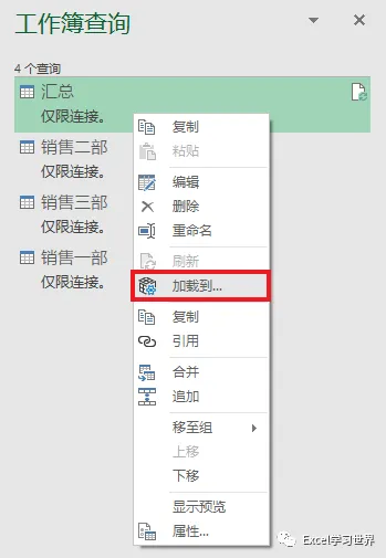 17. 在右侧的“工作簿查询”区域选中“汇总”--> 右键单击 --> 在弹出的菜单中选择“加载到”