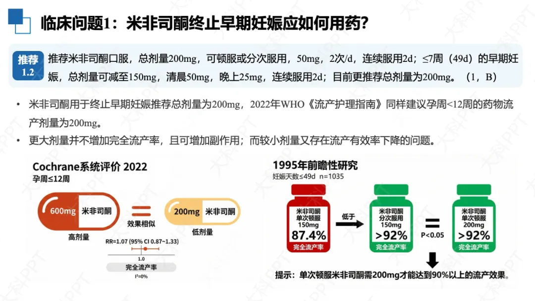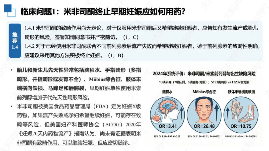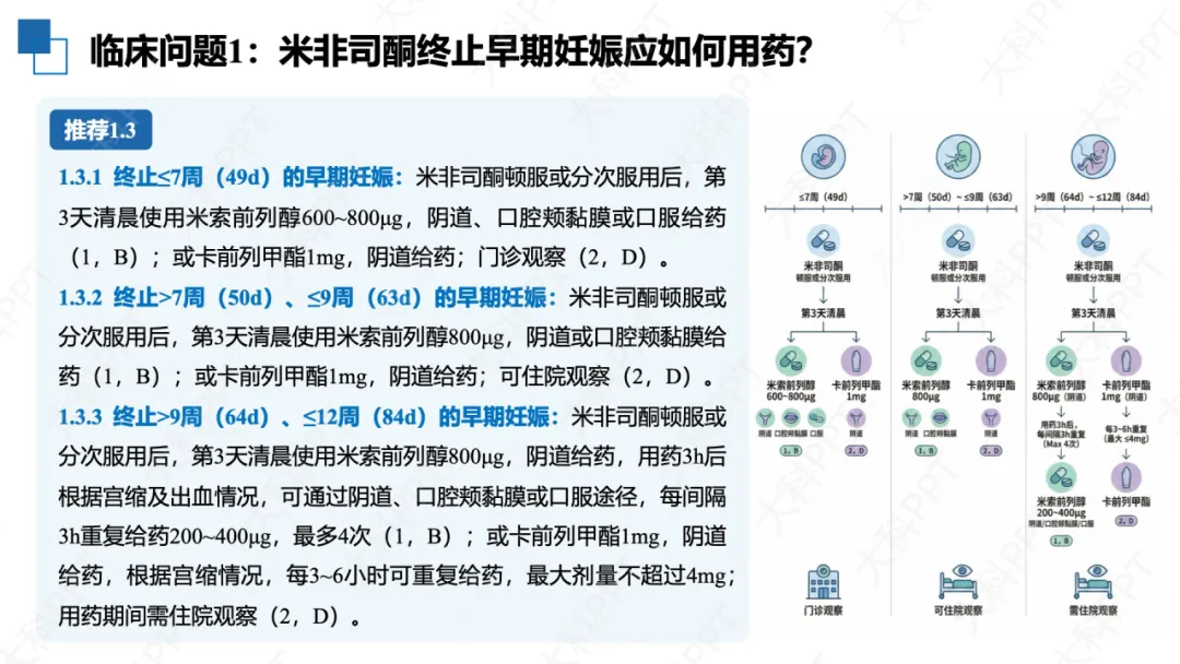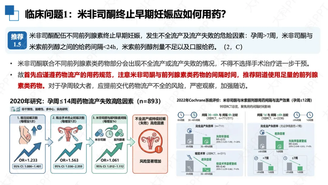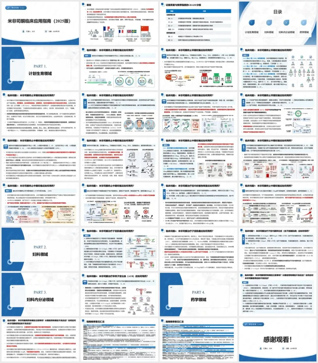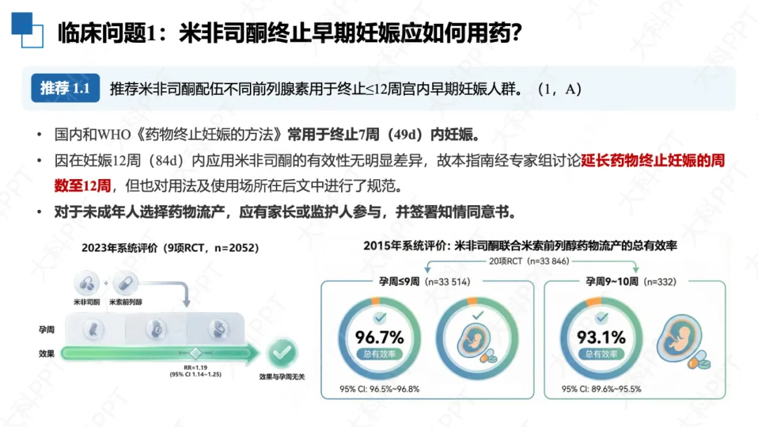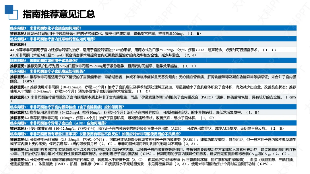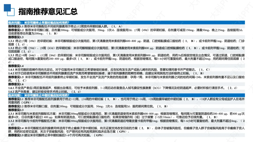 该领域围绕米非司酮在终止妊娠、软化子宫颈、紧急避孕等场景的应用展开,核心针对 4 类临床问题给出推荐。终止早期妊娠(≤12 周)推荐总剂量 200mg 口服,可顿服或分次服用,搭配米索前列醇或卡前列甲酯,按孕周细分给药方式与观察要求,孕周越大需更密切监测出血和宫缩。终止中期妊娠(>12 周≤16 周及 > 16 周 < 28 周胎膜早破)同样以 200mg 米非司酮为基础,需住院用药,瘢痕子宫人群需警惕子宫破裂风险。软化子宫颈推荐 200mg 剂量,可提高引产成功率、降低剖宫产率。紧急避孕需在无保护性行为后 72 小时内口服 25~50mg,用药时间越早效果越佳。同时明确了流产失败后继续妊娠的风险提示、不全流产的随访与处理方案,以及相关危险因素。(仅展示部分ppt)