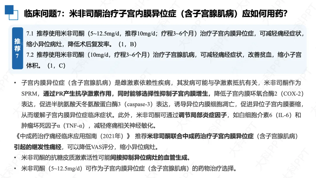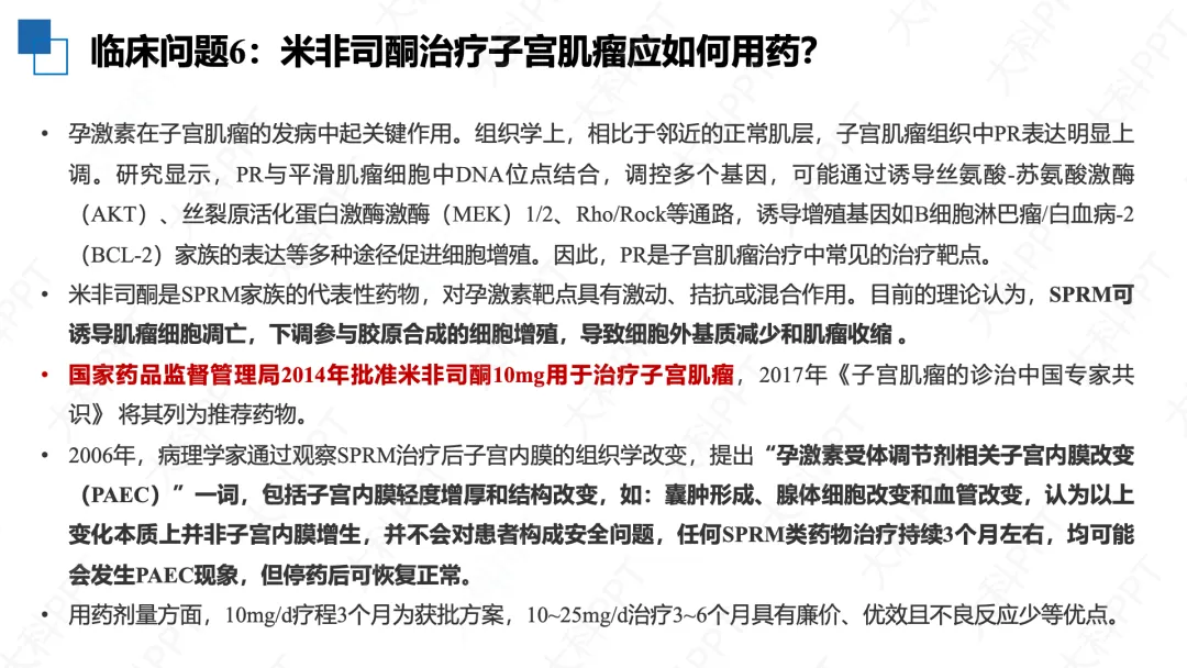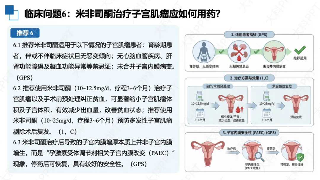 聚焦子宫肌瘤、子宫内膜异位症(含子宫腺肌病)、宫内妊娠物残留 3 类疾病的治疗。子宫肌瘤方面,适用于育龄期无恶变倾向且无禁忌证的患者,推荐 10~12.5mg/d、疗程 3~6 个月的方案,可缩小肌瘤体积、改善贫血,10~25mg/d 方案可预防术后复发,其导致的子宫内膜增厚为良性 PAEC 现象,停药后可恢复。子宫内膜异位症推荐 5~12.5mg/d(优选 10mg/d)、疗程 3~6 个月,能减轻痛经、缩小病灶、降低复发率;子宫腺肌病采用 10mg/d、疗程 3~6 个月方案,可缓解症状、改善贫血、缩小子宫体积。宫内妊娠物残留治疗适用于残留物≤2cm 的患者,口服 25~75mg / 次、2 次 /d,疗程 3~14d,或术前 3d 口服 25mg/d 联合清宫手术,能提高疗效、减少并发症。