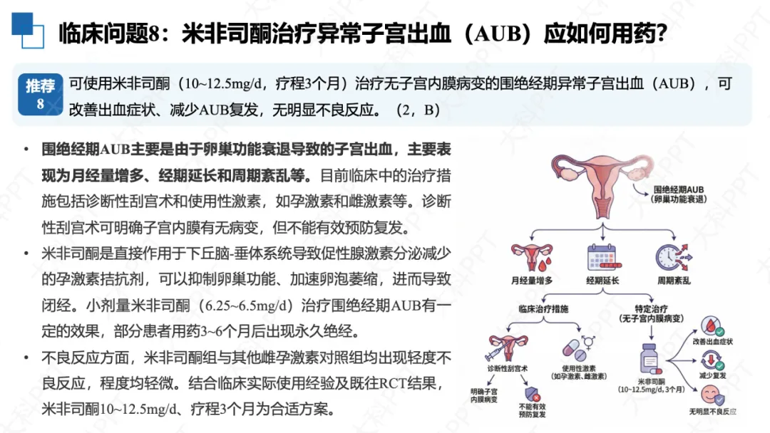 核心针对围绝经期异常子宫出血(AUB)的治疗,明确米非司酮的适用人群为无子宫内膜病变的患者。推荐剂量 10~12.5mg/d,疗程 3 个月,该方案可有效改善出血症状、降低复发率,且无明显不良反应。相较于低剂量(≤6.5mg/d),高剂量米非司酮治疗有效率更高,且优于部分孕激素类药物,与雌激素类药物疗效相当。其作用机制为通过拮抗孕激素抑制卵巢功能、加速卵泡萎缩,进而实现闭经。用药期间无需特殊监测严重不良反应,仅需关注轻微的皮疹、潮热等症状,适合作为诊断性刮宫术后的后续治疗选择,以弥补刮宫术无法预防复发的不足。