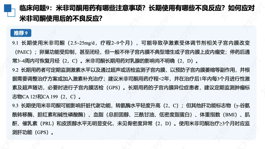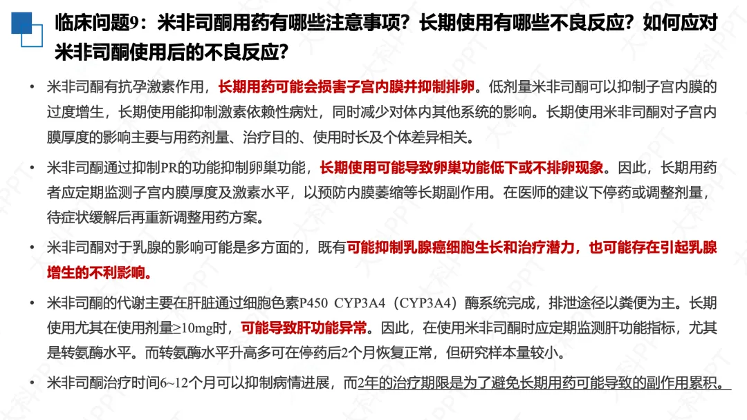 重点阐述米非司酮长期用药的注意事项、不良反应及应对措施。长期用药(2.5~25mg/d,疗程 2~9 个月)可能引发 PAEC 现象、卵巢功能抑制甚至闭经,但停药后 3~4 周多可恢复月经,且不伴内膜不典型增生;对乳腺影响尚不明确。肝功能方面,可能出现转氨酶轻度升高,治疗≥3 个月时需定期监测,其他代谢指标无明显异常。用药疗程建议 < 2 年,治疗后 1 年内每 3 个月需复查性激素及超声,必要时行子宫内膜活检;子宫内膜异位症患者还需监测 CA₁₂₅和 CA₁₉₉。应对措施包括根据监测结果调整治疗方案、必要时加入激素补充治疗,转氨酶升高多在停药后 2 个月内恢复,需避免长期用药导致副作用累积。