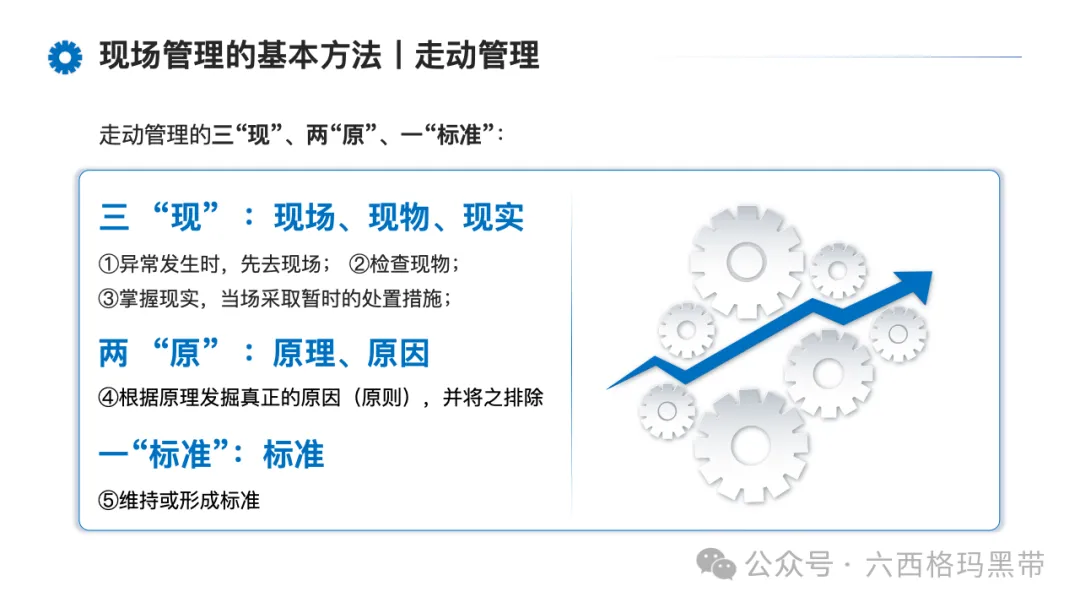 走动管理是一种有效的现场管理方法,强调管理者要深入生产现场,及时发现问题并采取措施。其核心包括三“现”、两“原”和一“标准”: