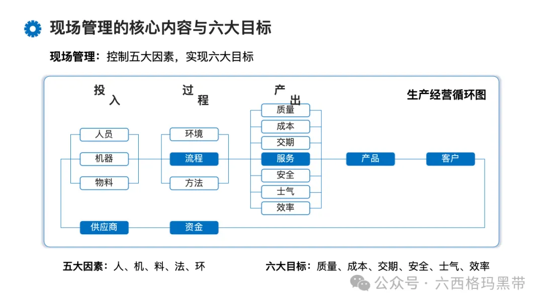现场管理的核心是控制五大因素(人、机、料、法、环),以实现六大目标: